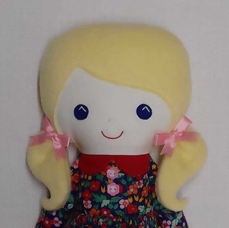 Her light blonde hair is made from soft fleece and worn in bunches fastened by pink ribbon bows. She has blue eyes made from felt. Her red mouth and tiny nose are securely hand embroidered.