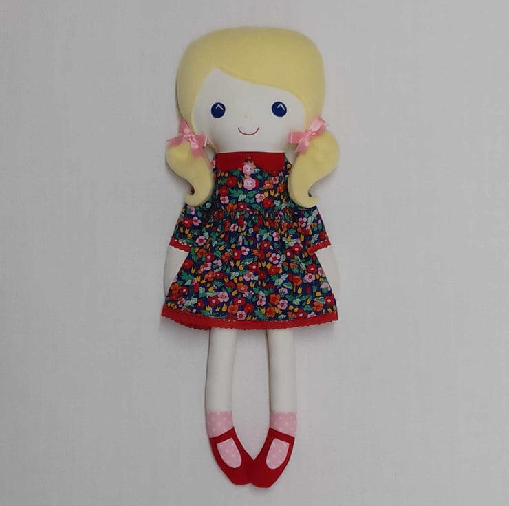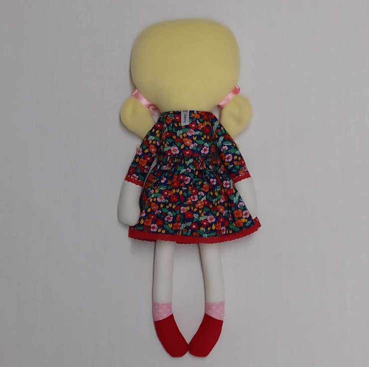 She is wearing a pretty dress, covered in flowers, which has a red collar and red lace around the hem and sleeves. There are two pink and white flower buttons securely sewn onto the front of her dress. She is wearing pink spotty socks and red Mary-Jane shoes. Her body and dress are made from cotton fabric which is firmly stuffed with new flame retardant polyester. Although her skirt can be removed the rest of her clothes cannot.