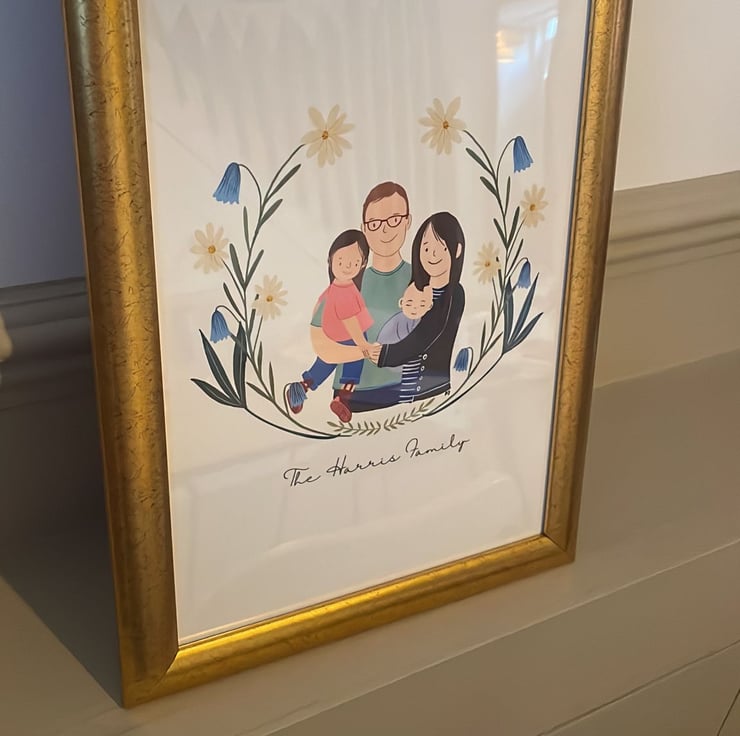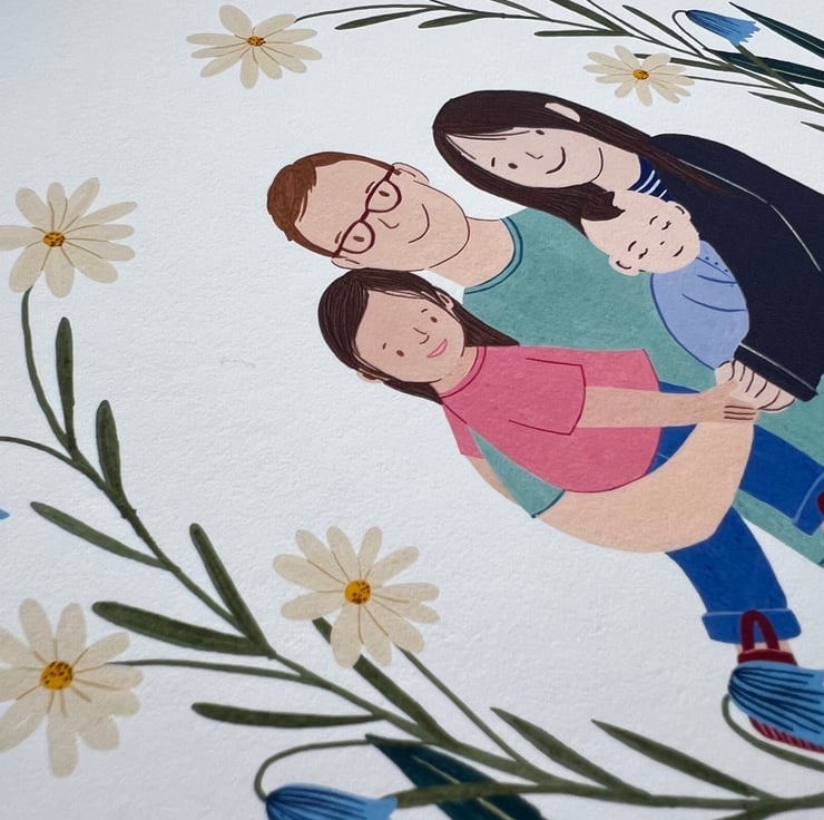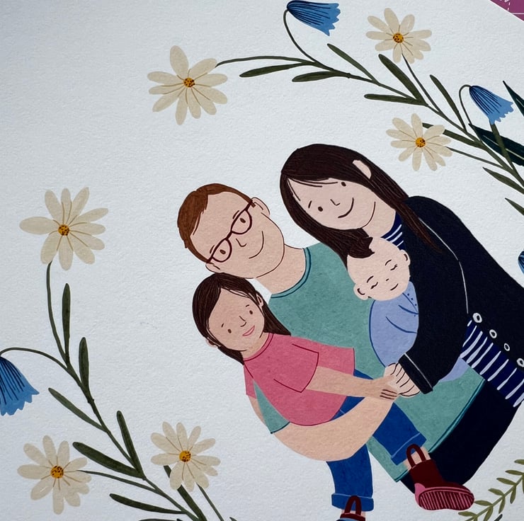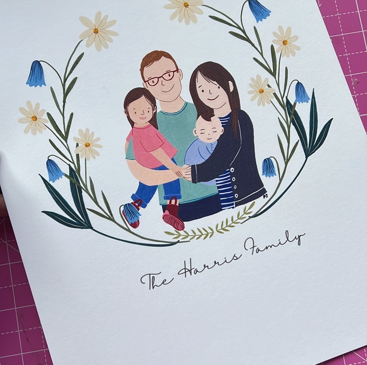 I love to draw unique, custom and personalised family illustrations, with or without florals. Like the one above I drew a beautiful floral wreath around to give it a unique special look.