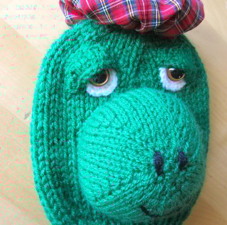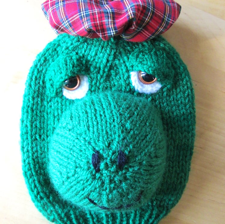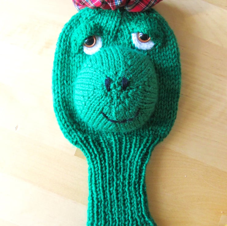 Hand knitted cover for golf club, suitable for a driver club. Lovely Loch Ness Monster design. Ideal gifts for the golfer in the family.