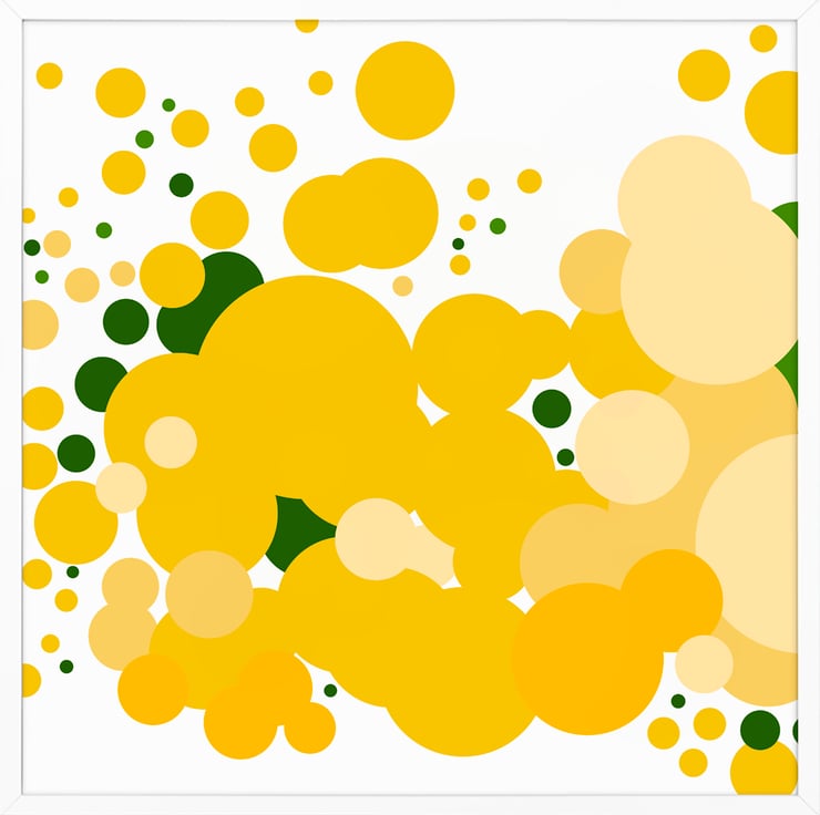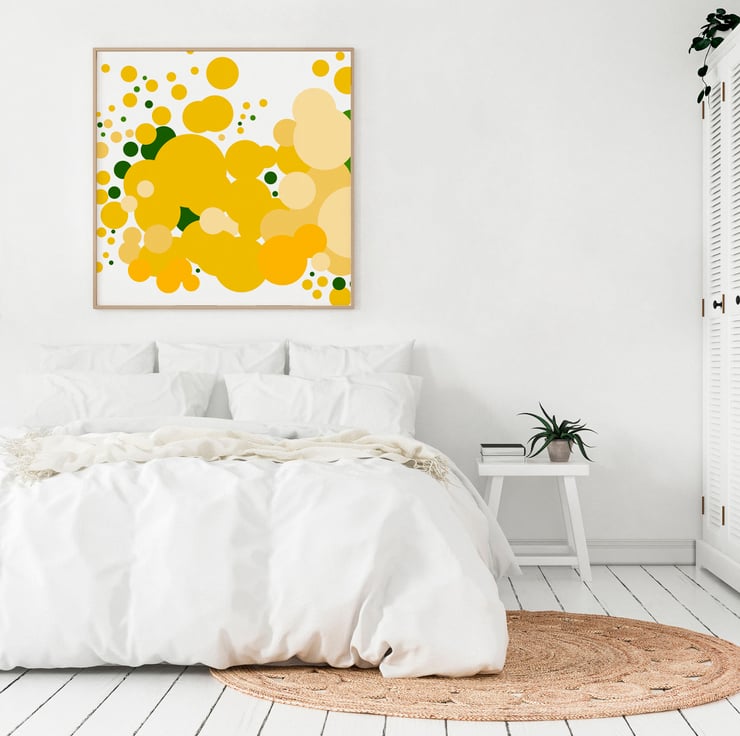 This print features a captivating interplay of geometric shapes and abstract floral patterns radiating from a central sunburst motif. The vibrant yet harmonious colour palette infuses warmth and energy into any room, while the meticulous arrangement of shapes creates a dynamic visual appeal. Perfect for contemporary and modern interiors, this wall print adds a touch of sophistication and artistic flair to your living room, bedroom, or office.