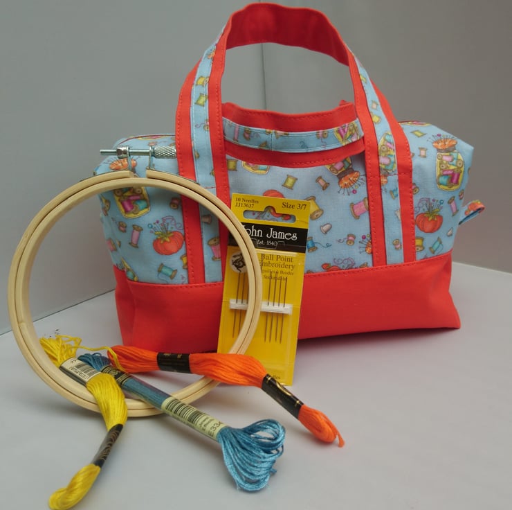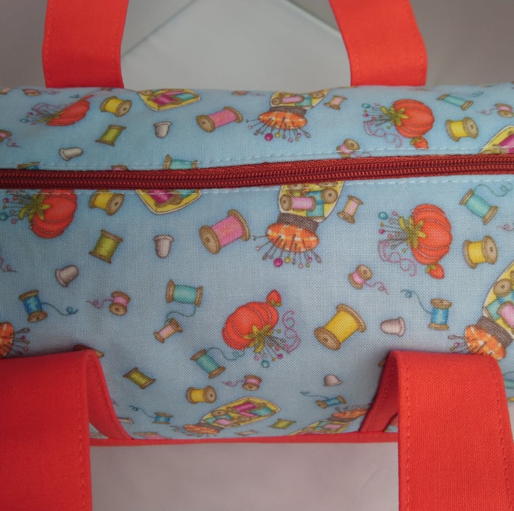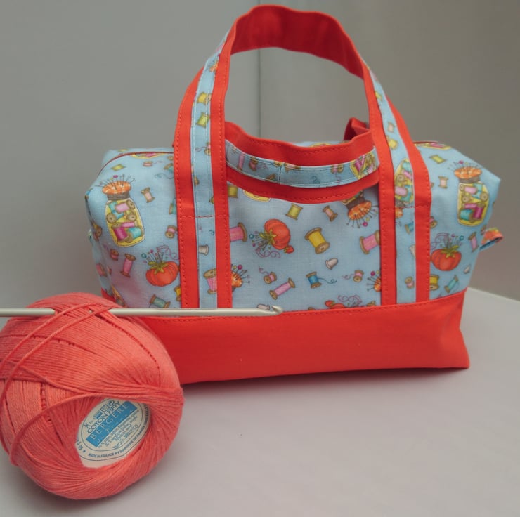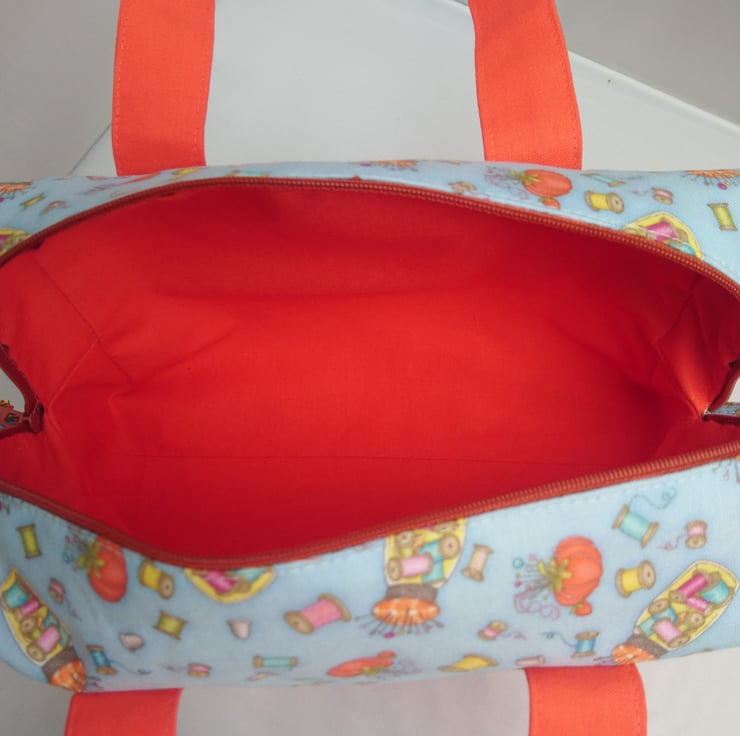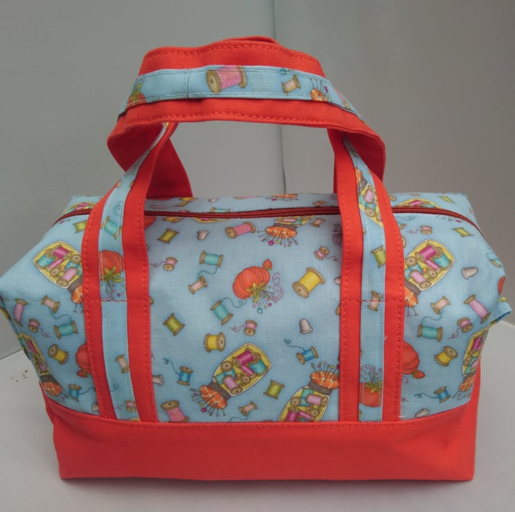 Bags, Project ,Handled Box Shape Bag in a two colours , plain orange and a lovely blue fabric that has sewing accessories over it. The Lining is the plain orange fabric. The handles are enhanced with the patterned fabric over the plain fabric. Multi use Option. This Bag is made of 100% cotton fabric inside and outside. It has interfacing between the layers for support