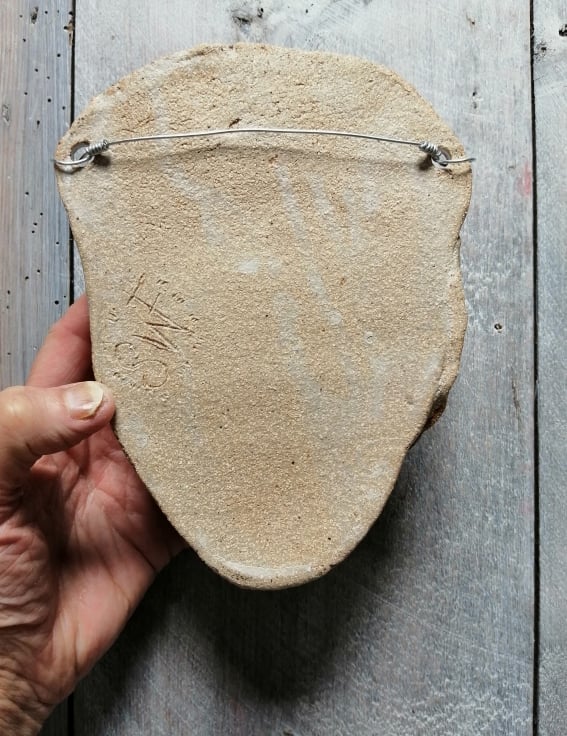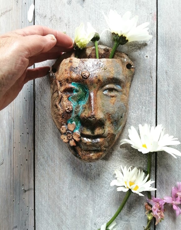This Ceramic Art Wall Pot, has been made from robust Stoneware clay, using handbuilding ceramic methods such as modelling, slab rolling and press moulding using a collection of clay moulds made by myself of various plants and oother found materials.
