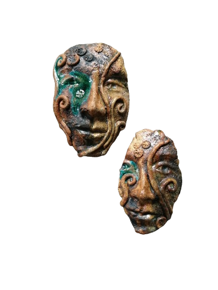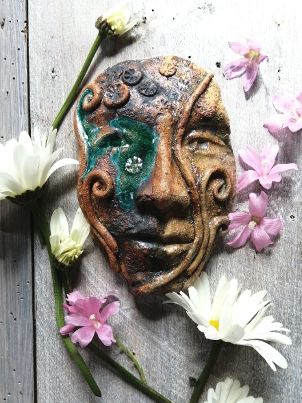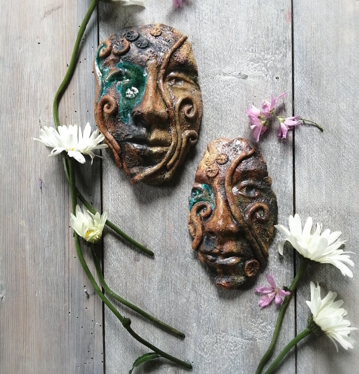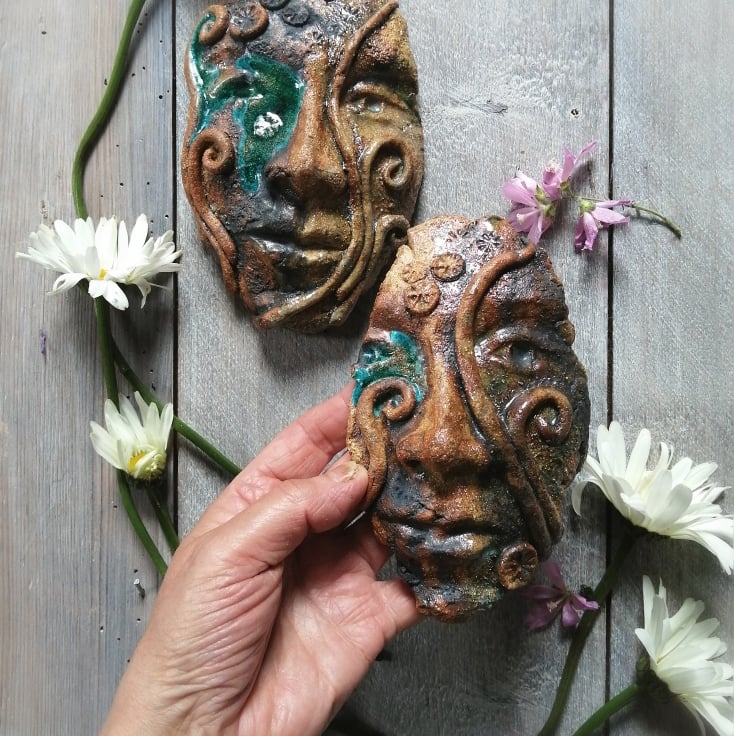 These pair of ceramic, humankind/nature wall hangings have been inspired from a recurring theme running throughout my work, conveying a sense of the often fragile balance between humankind, nature and an interest in Folklore and Mythology, often connected to the rythmn of the seasons and the time of the year.