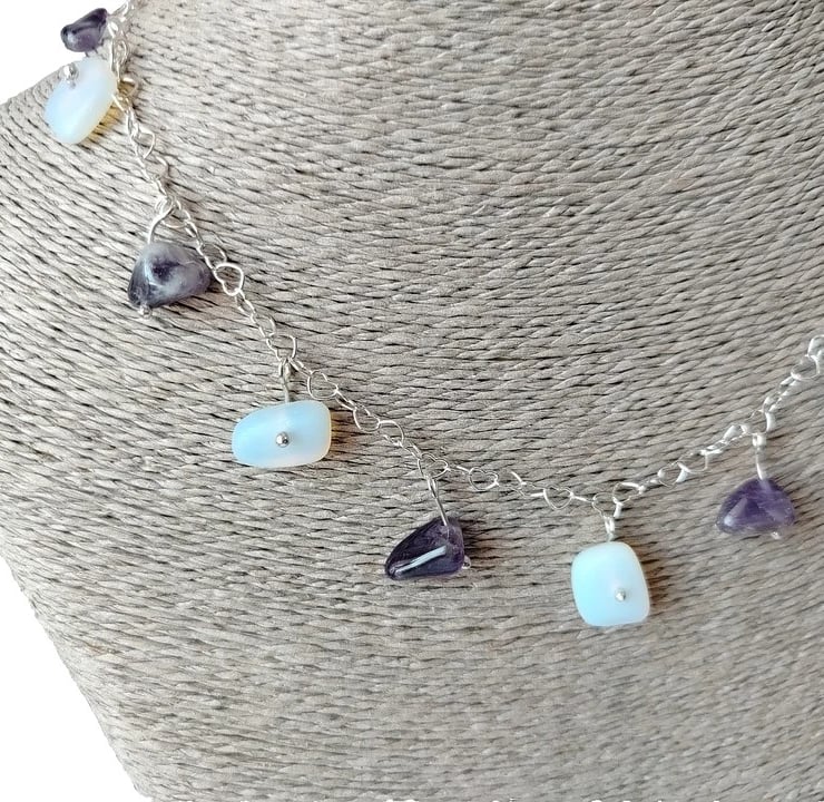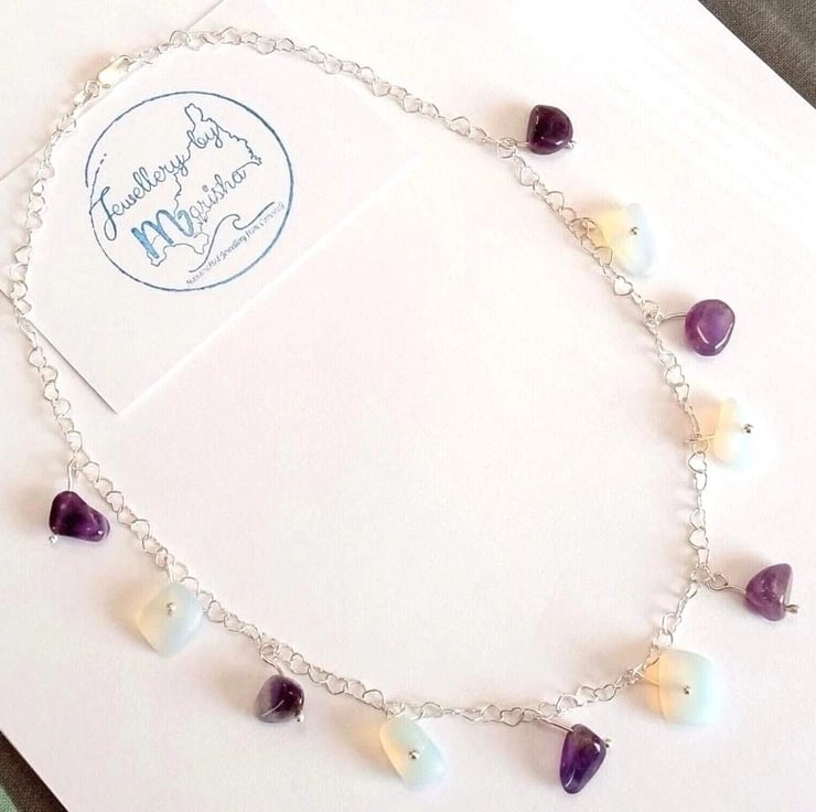 Sterling Silver 925 Heart Necklace with Milky Opal White Seaglass & Amethyst Nugget Charms