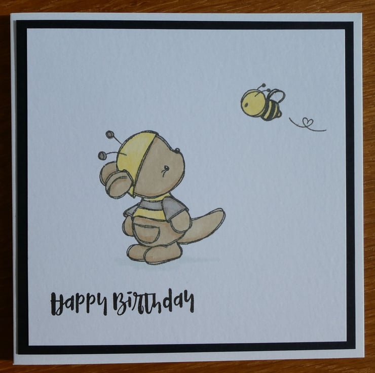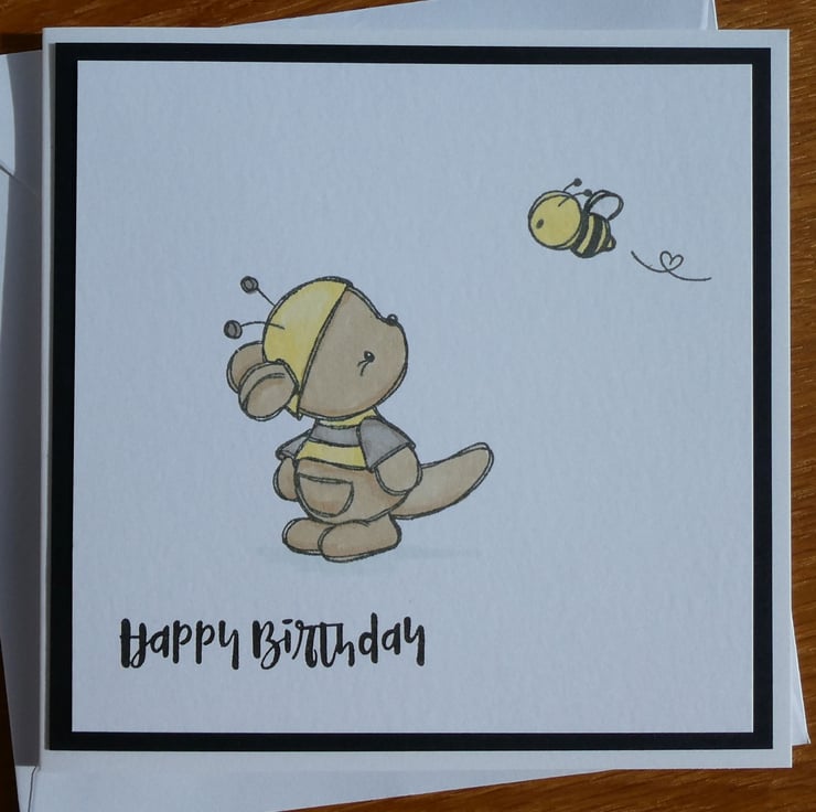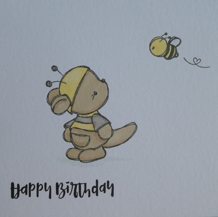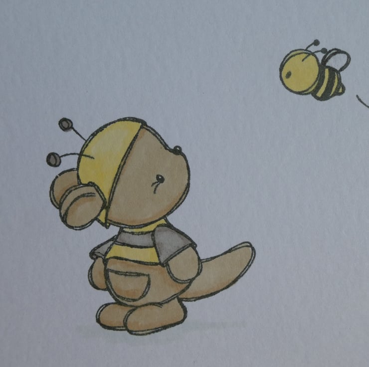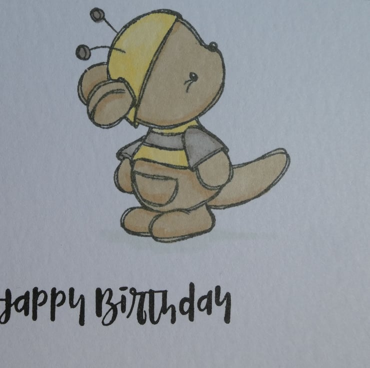 It has been hand stamped with an image of a cute kangaroo dressed in a stripy black and yellow bee costume looking up towards a bee with glittery pearlescent wings.
