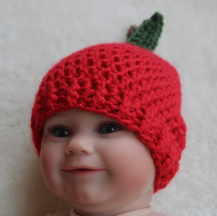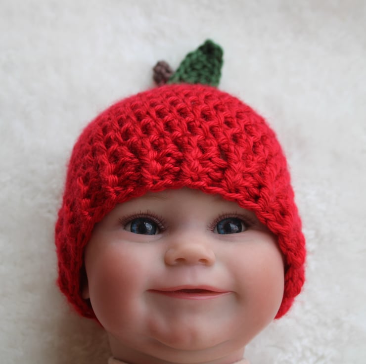 The red apple hat is in a beanie style and features a taupe coloured stalk and a dark green leaf.