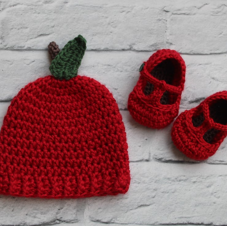 A sweet red apple themed hat and shoe set that is perfect for the newest baby girl in your life.