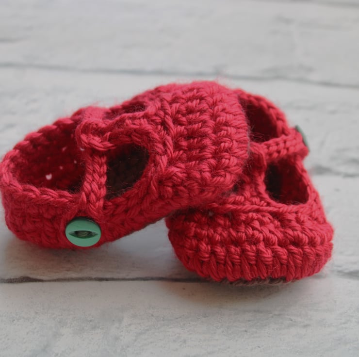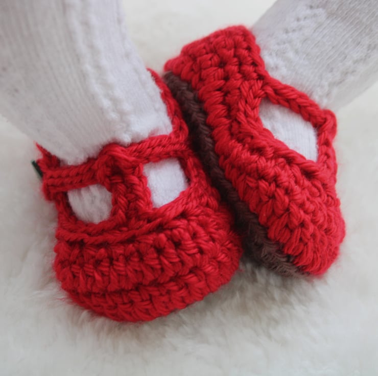 The shoes are in a traditional t-strap style and feature a taupe coloured sole, red shoe and green buttons.