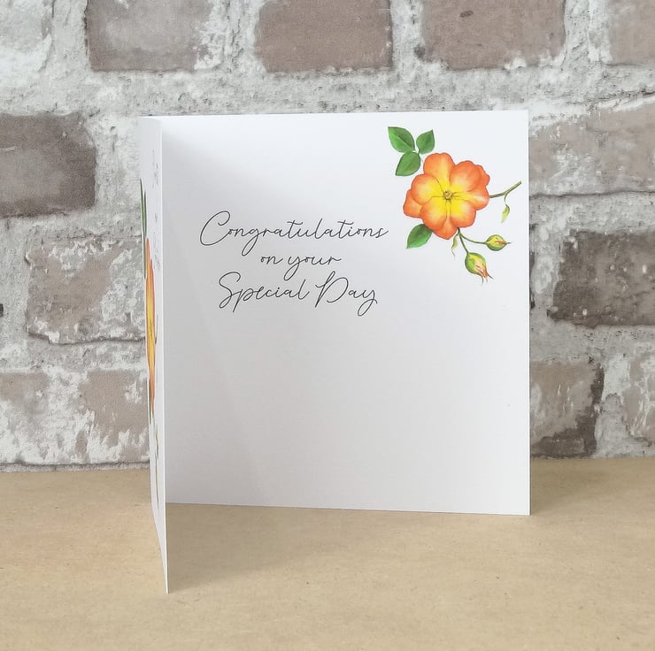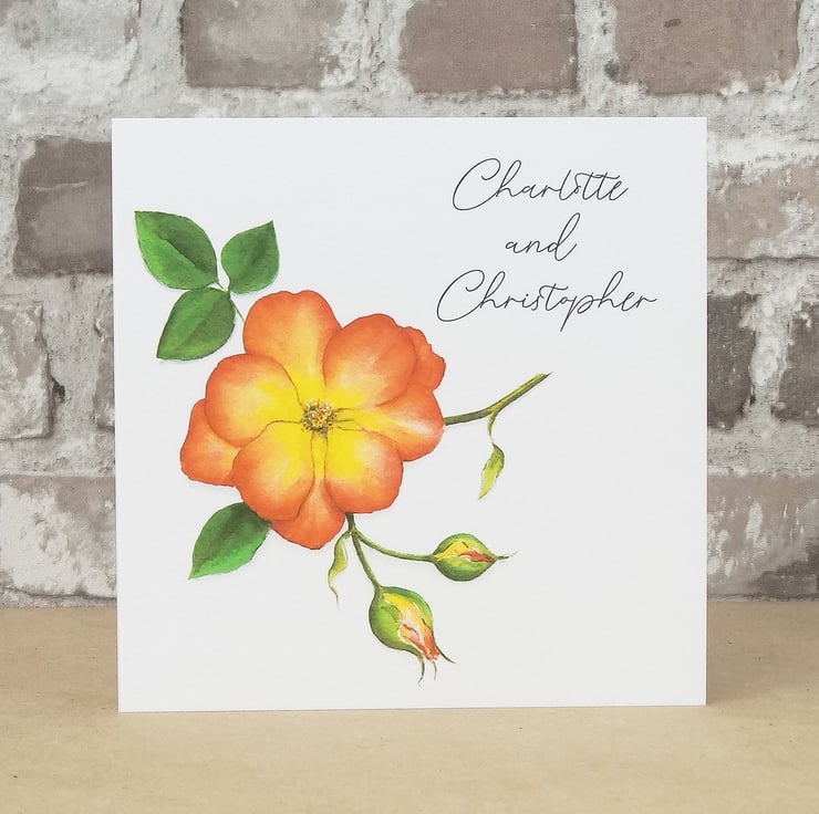 This personalised Rose Wedding card is printed with my original artwork on white texture FSC approved 280gsm card and comes with a brown kraft envelope protected in a clear biodegradable bag.