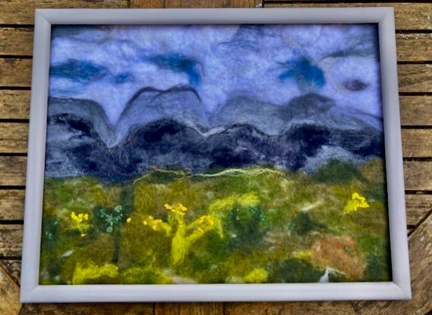 This picture of the moody mountains in the Ariege region of France, has been made using the wet felting process. The method uses different types of wool to create the colours and depths. of the scenery.