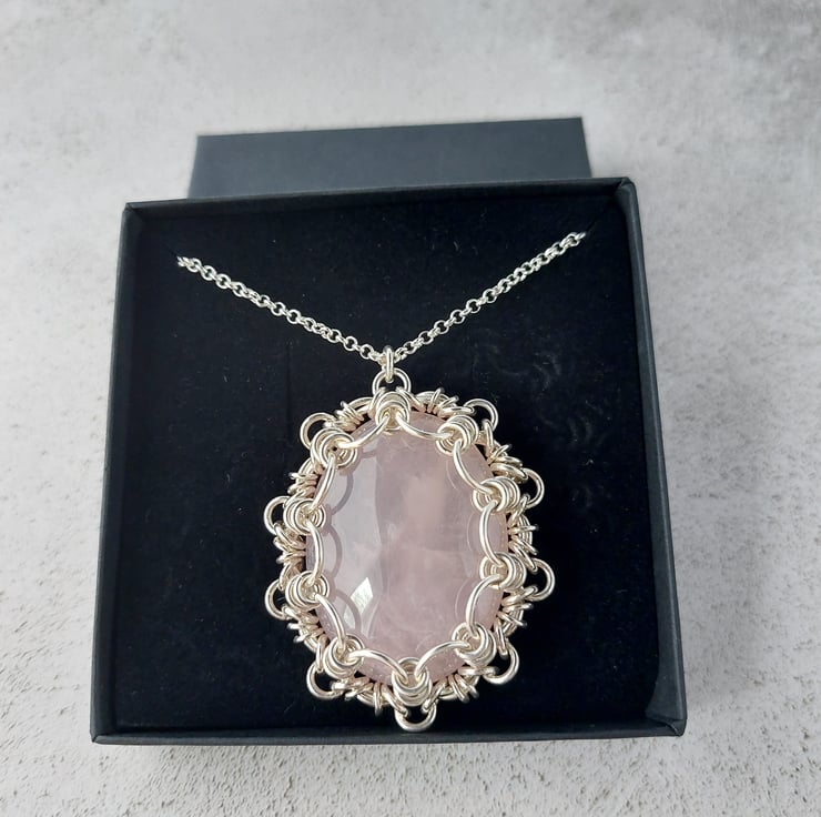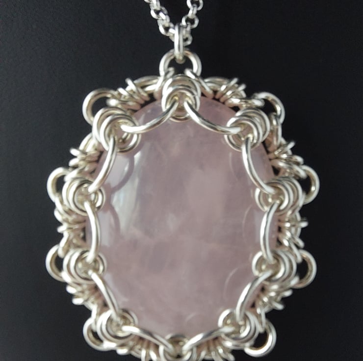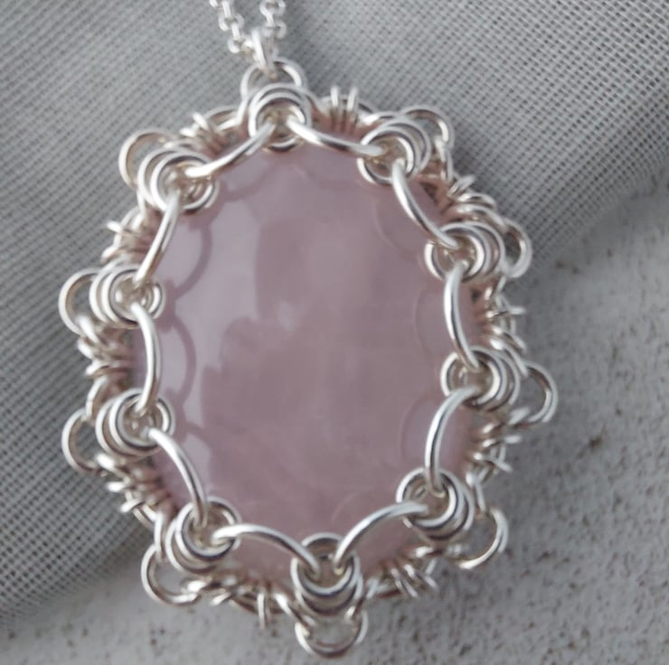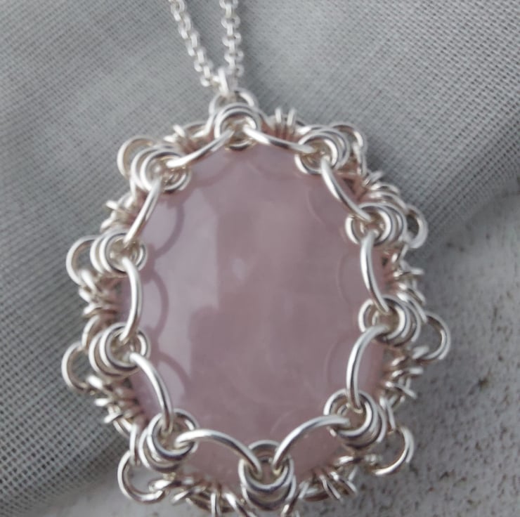 A beautiful sterling silver chainmaille pendant with a gorgeous rose quartz cabochon stone captured within it. The pendant is made from individual sterling silver rings, each one woven together. Rose quartz is the birthstone for January.