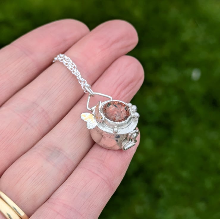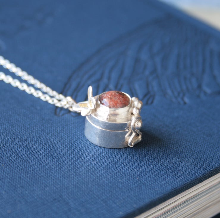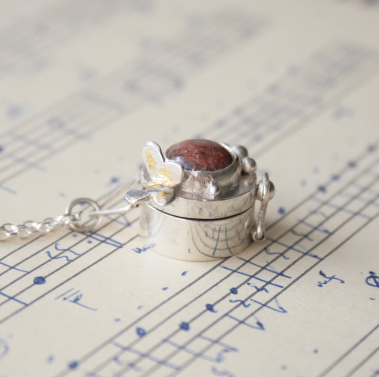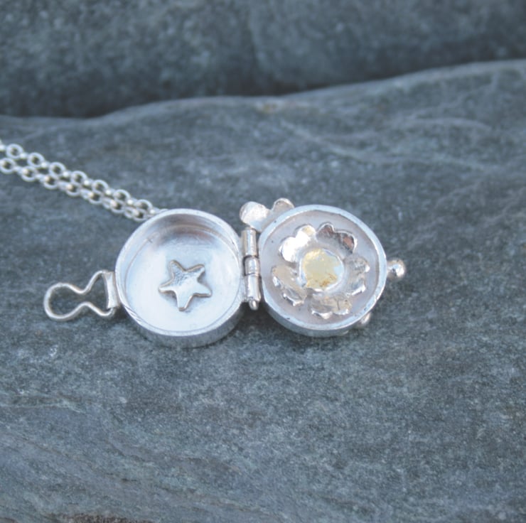 I have handmade the locket using traditional techniques and recycled sterling silver. A little silver and gold butterfly sits at the side of the locket and 24 kt gold foil is applied using the ancient technique of Keum Boo. Inside the locket is a silver and gold Scottish primrose flower and a tiny little star.