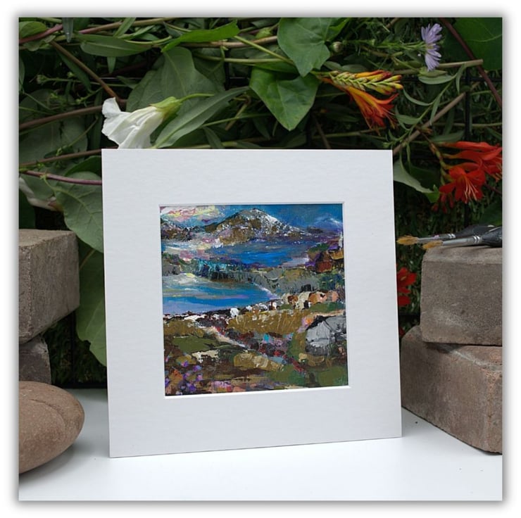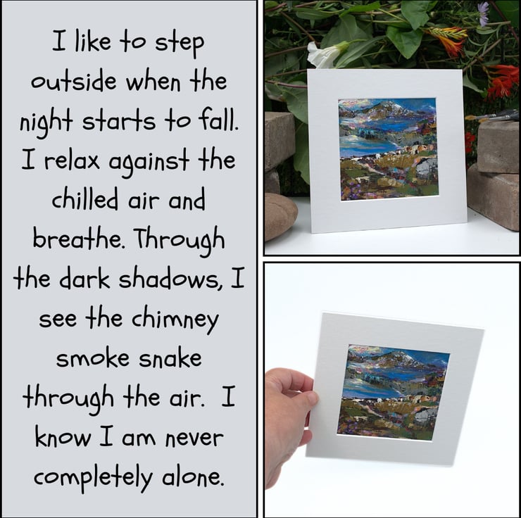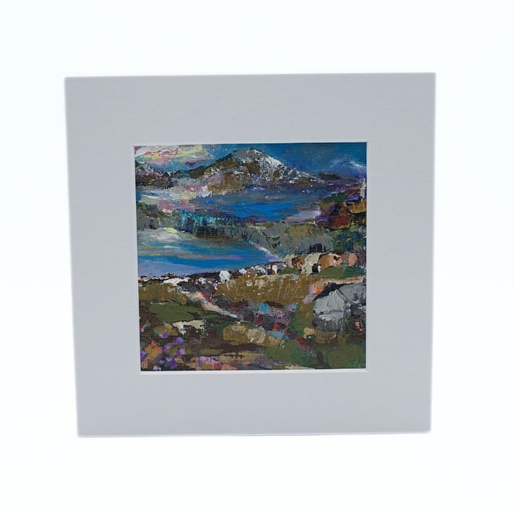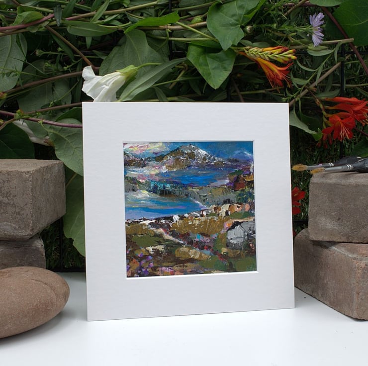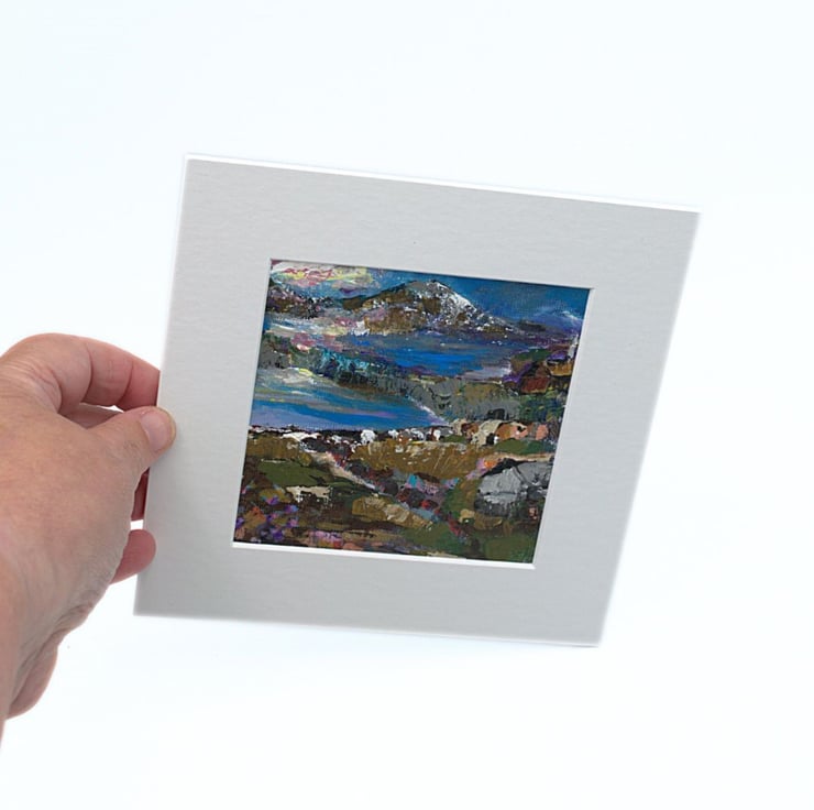 This is a small mounted, original painting. It features a Scottish landscape as evening approaches. The sky and sea are both calm and are a deep sapphire blue. There is the hint of small cottages with their fires burning and the land is peppered with rocks. I have used professional quality acrylic paint with painting knives to depict the sea and sky. I have used a variety of brushes to outline the ruggedness of the land and the small dwellings.