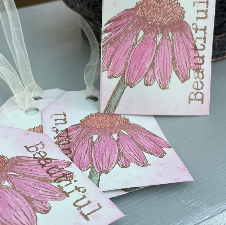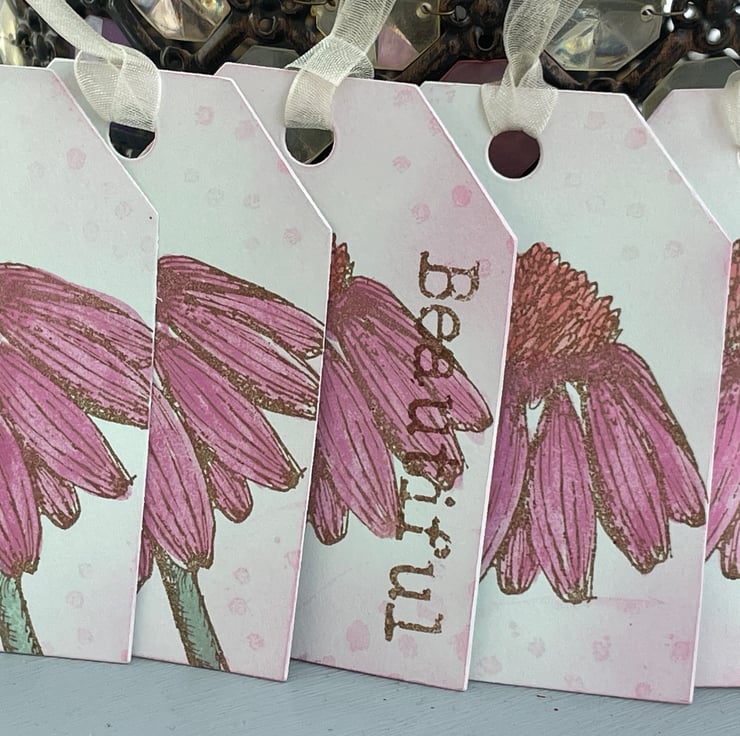 A modern and fresh take on gift tags. These 8.5x6cm gift tags are made from the palest green card and die cut with a highlights crafts die. Each tag has been individually stamped with an Echinacea flower and had coloured. The background has been lightly stamped with dots and has pink blended ink to finish the design. They have the word Beautiful stamped on them. The back is blank for your own message and there is an organza ribbon to tie to your gift. All are handmade and therefore are all different and totally unique. A beautiful addition to any gift.