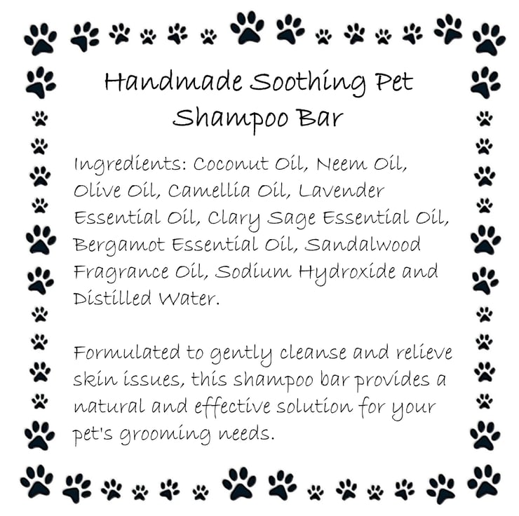 This pet shampoo bar is crafted with a blend of nourishing oils including coconut, neem, olive & camellia, and enriched with the calming scents of lavender, clary sage, bergamot, and sandalwood.