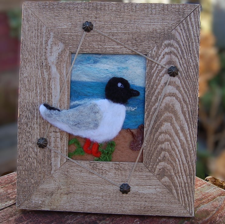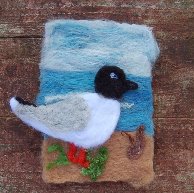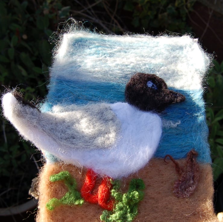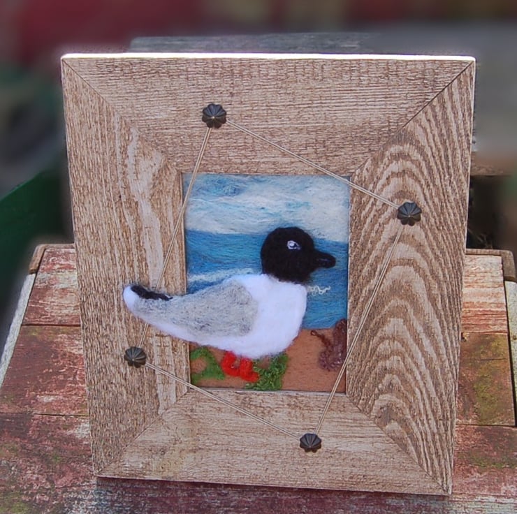 I have made the gull by needle felting wool fibres into shape. The seascape background is needle felted onto vintage blanket.