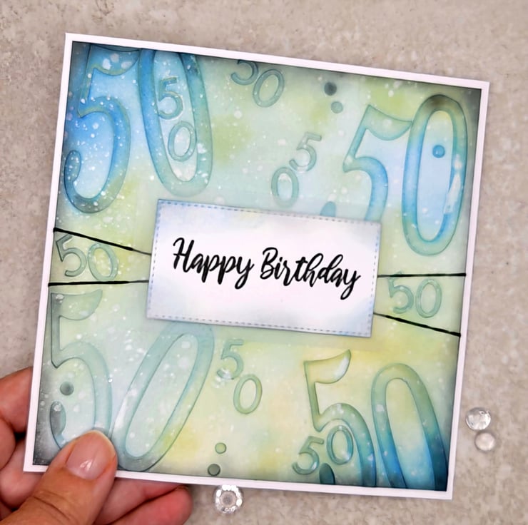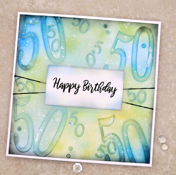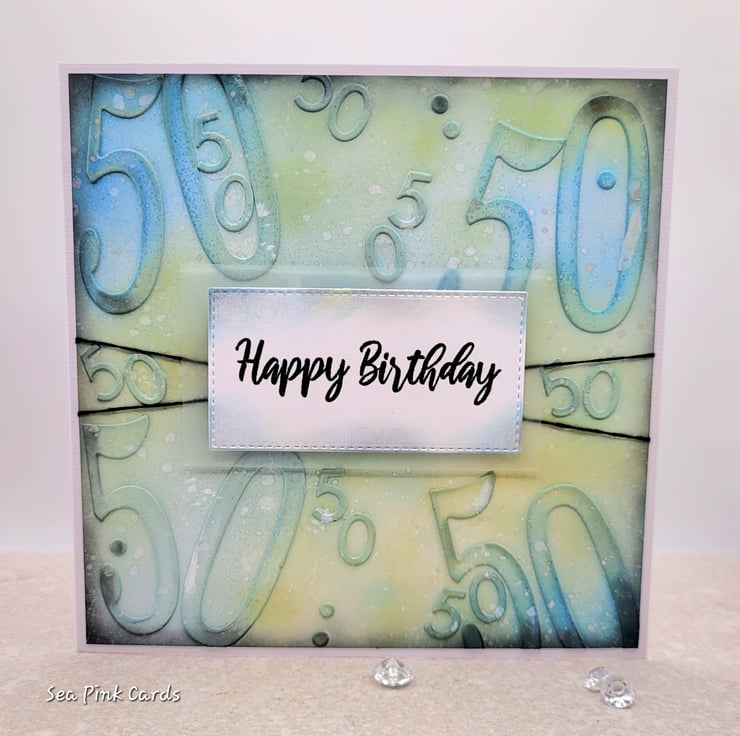 The card measures 14.5 x 14.5 cms and will be supplied with a 100% recycled brown kraft paper envelope. The 50 numbers have been die-cut by hand and added to the focal panel, then inked with archival ink in a distressed style. Small circles and splashes of metallic white ink have been added for detail. Handmade using quality 300gsm white linen card.
