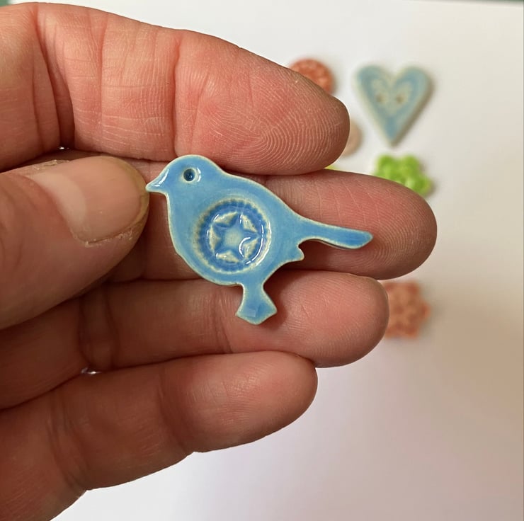 Small ceramic mosaic tiles including birds, words, flowers and leaves.. Measuring from 0.5cm - 3cm x 0.4cm deep.