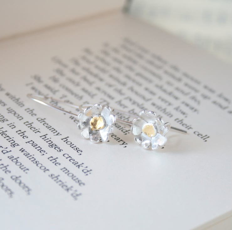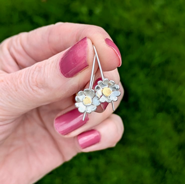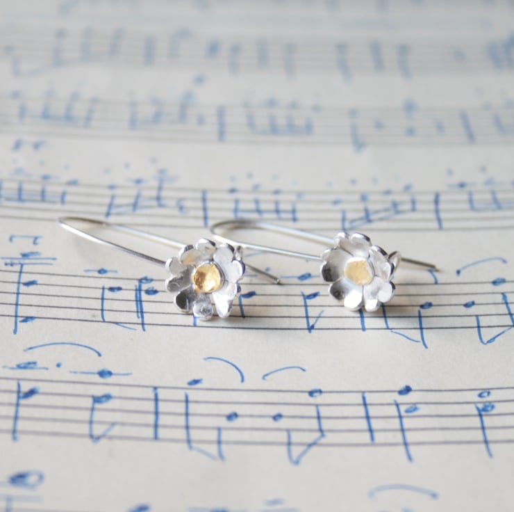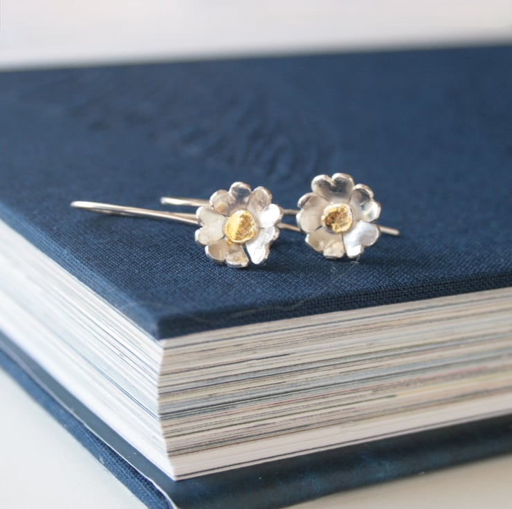 The centre of the silver flowers has a layer of 24 kt gold foil applied to it using the traditional technique of Keum Boo. The ear wire threads through the ear and fastens at the back of the flower.