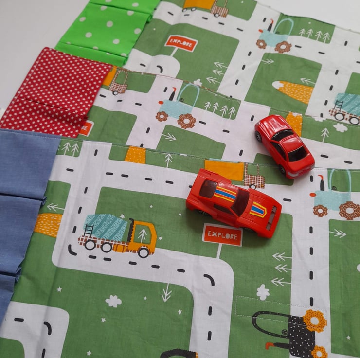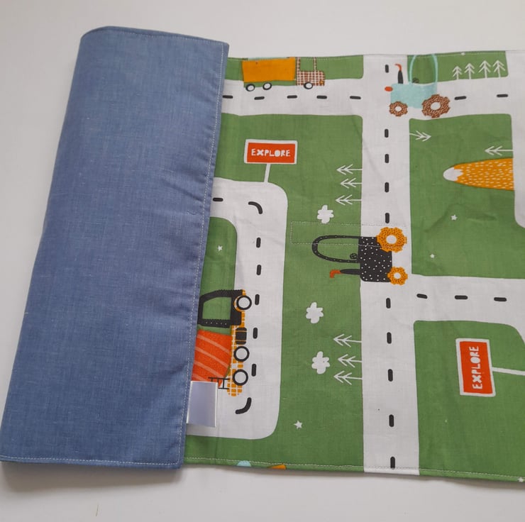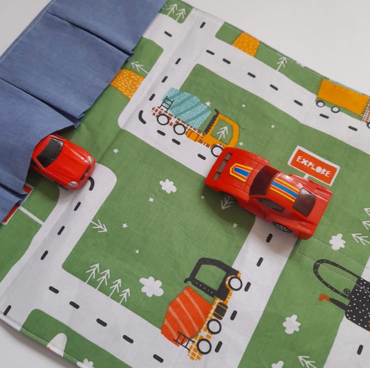 This is a folding car play mat. Perfect for home or to take with you while on the go. It has space to store up to 4 cars (not included) and has a Velcro closure tab.
