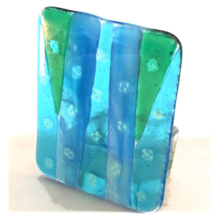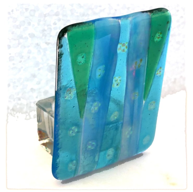 I've made a dramatic flare design on the candle front panel in shades of turquoise and decorated it with pieces of dichroic glass so it has a rather wonderful sparkle where it catches the light. This gives the candle holder a really luxurious finish.