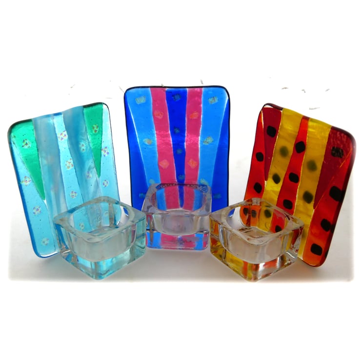 The fused glass candle holder front measures 10 by 8cm.