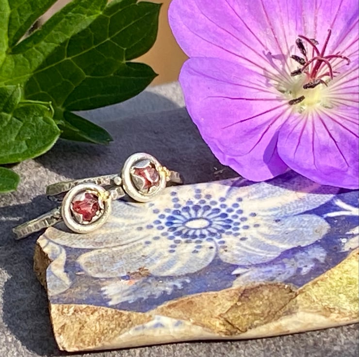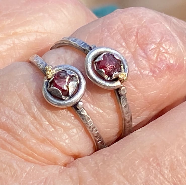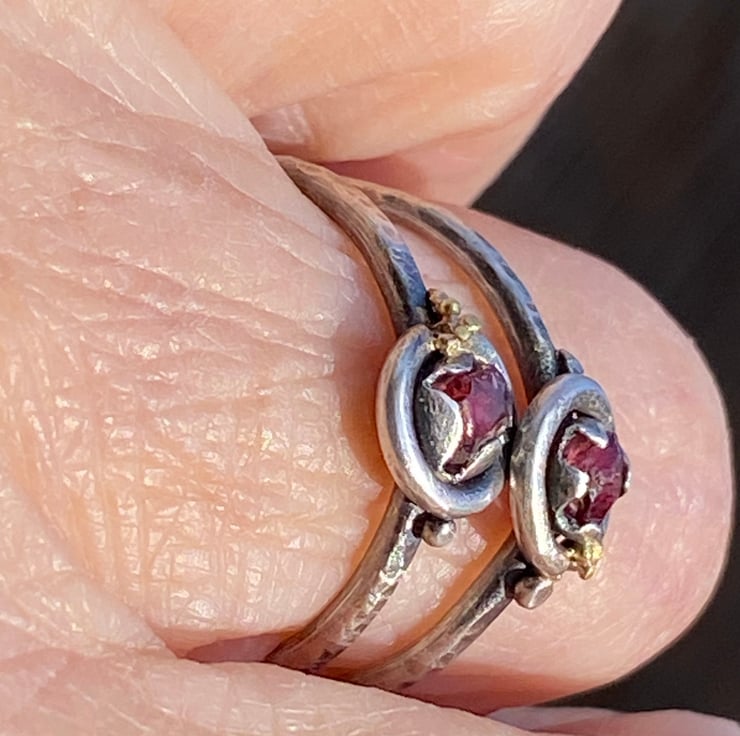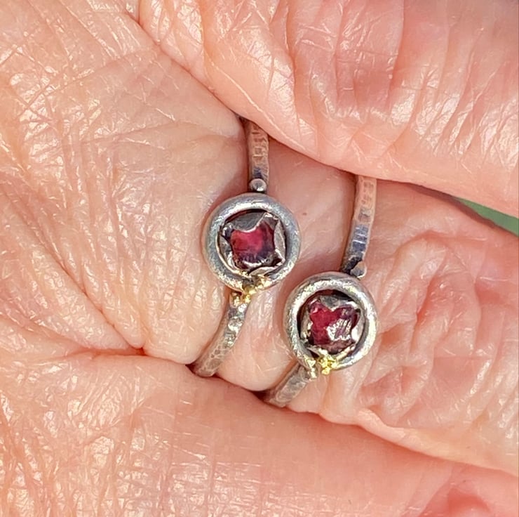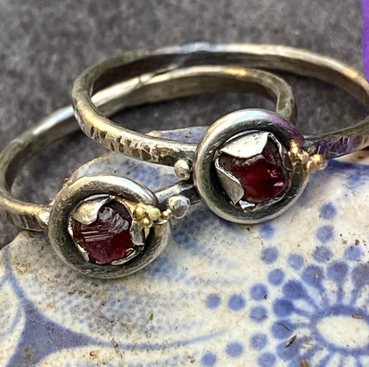 One pretty silver ring with a 2mm hammered band and natural Thames Garnet ‘shard’. Also embellished with a gold accent for luck and it has a patina added to enhance the detail. Please state your US or UK ring size via Options.