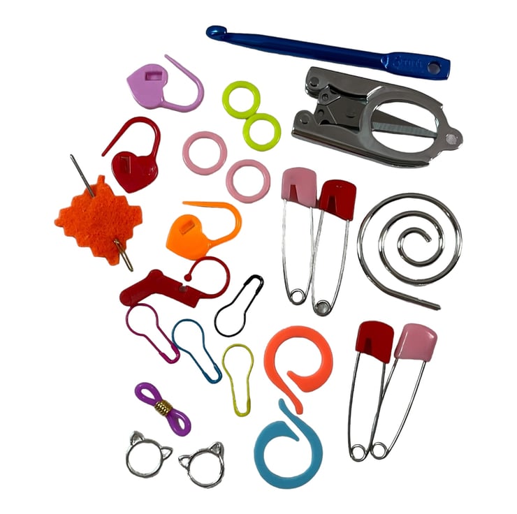 This handy little box folds up ingeniously to hold everything securely and separately. There is the option to choose to have box filled with contents, these I have sourced to fit perfectly in the compartments and offer a concise kit, this is a slightly more premium selection to my usual boxes found here- https://www.etsy.com/uk/listing/1489616573/knitting-notions-box-rigid-multi comprising of a spiral cable needle, scissors, crochet hook along with a selection of stitch markers, needle stitch minder, safety pins for stitches and one (2 in the cat box) themed metal lobster hook closing marker.