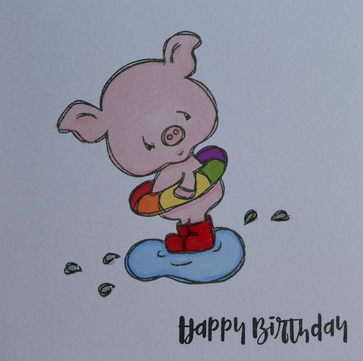 This colourful birthday card features a hand stamped image of a pig splashing in a puddle and has the message Happy Birthday.