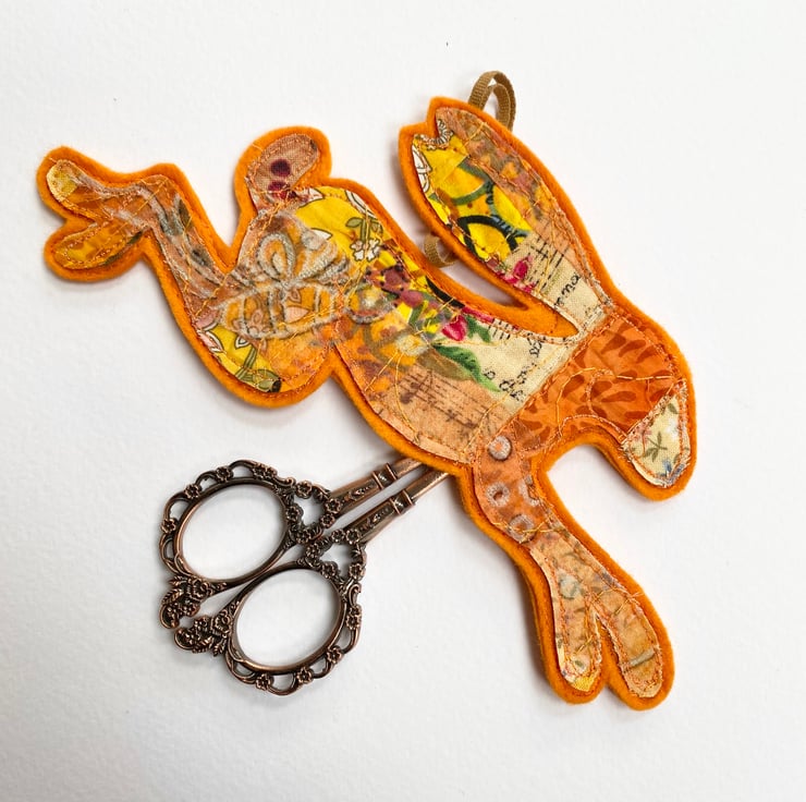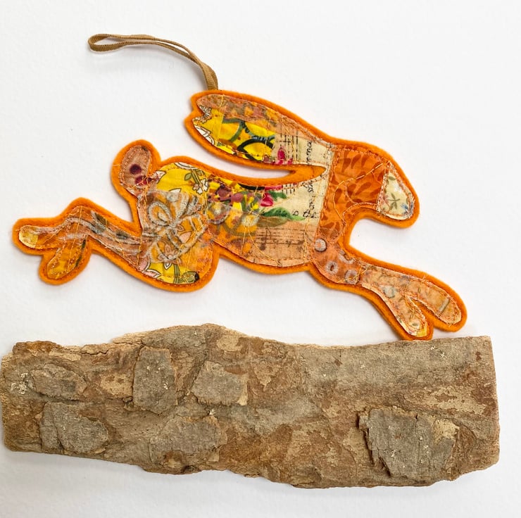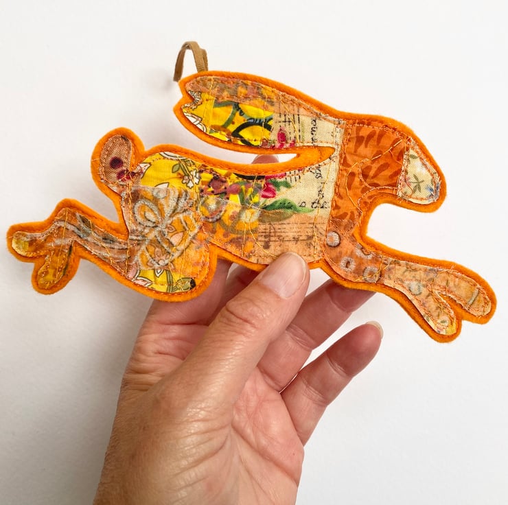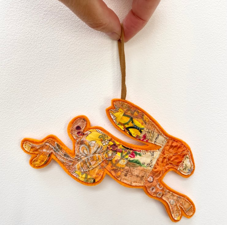 This charming embroidered leaping hare home decoration has been made from up-cycled fabrics and stitched down with free motion embroidery. It comes felt backed and measures 8.5 x 19cm, with the matching ribbon the length is 16cm approx.