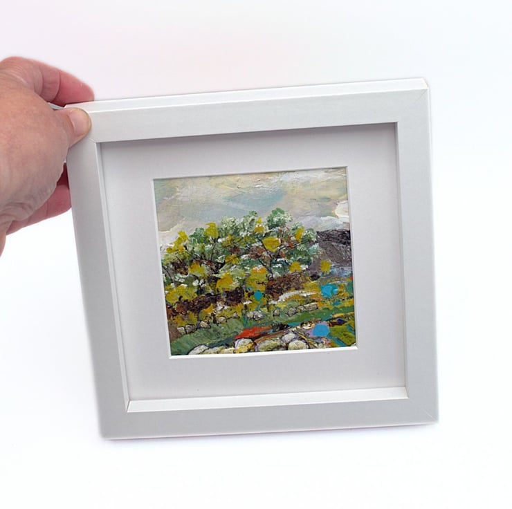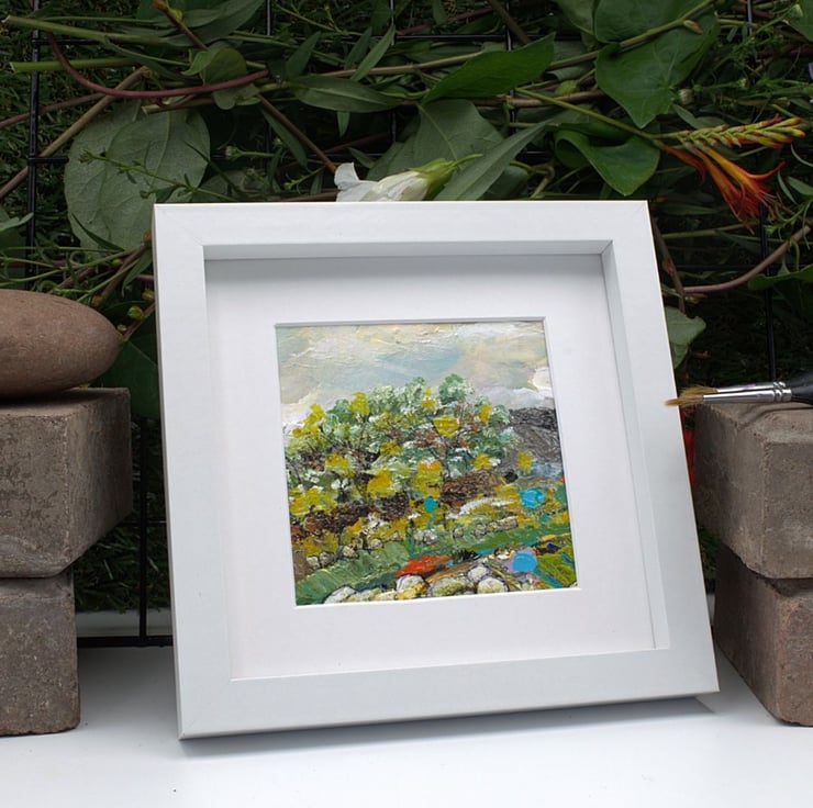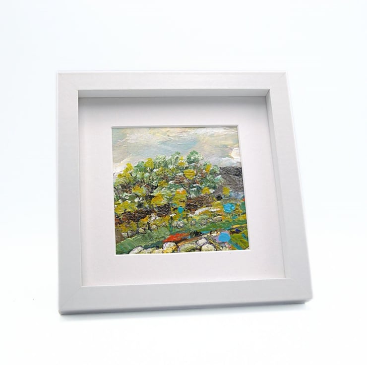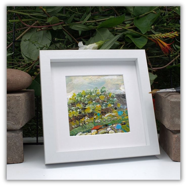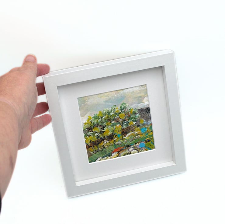 This is an original landscape painting, set in a contemporary white frame. The painting can be free standing or hung. It is a lovely day, the sky is full of bright, iridescent clouds which casts a veil of light over the hills, trees and rocky boulders. I have used a mixture of painting knives, small brushes and blunt twigs to apply thick layers of paint over the surface to give a sense of beauty and ruggedness.