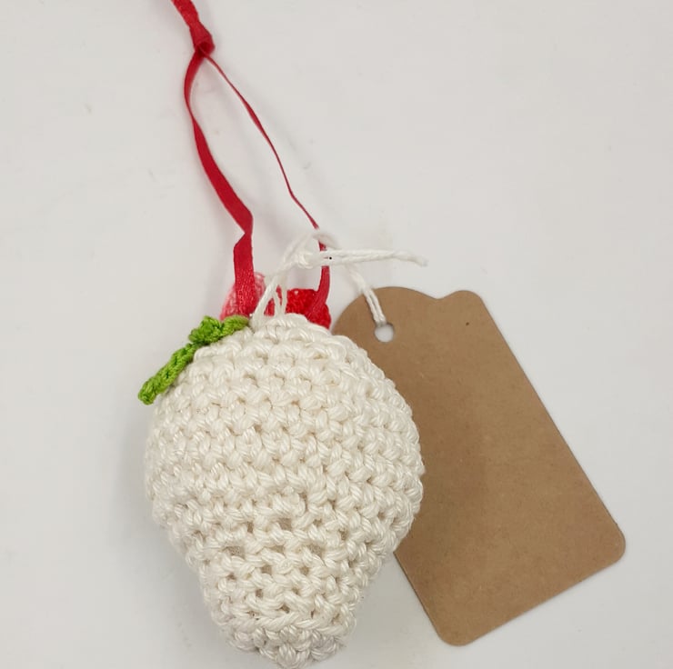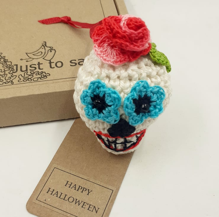 This pretty hanger is a squidgy take on a Mexican sugar skull. It is crocheted and embroidered in 100% cotton and is stuffed with polyester filling. It is embellished with a tiny crochet rose on top and hangs from a narrow satin ribbon. The tag reads 'Happy Hallowe'en' on one side and is blank on the other for your own message.It comes in a labelled PIP (Postage in Proportion) box and can be posted at the large letter rate rather than as a parcel – the skull will need a tiny bit of plumping up after its journey!