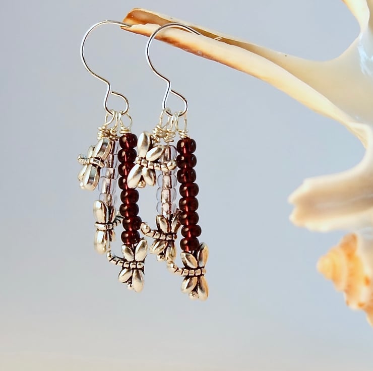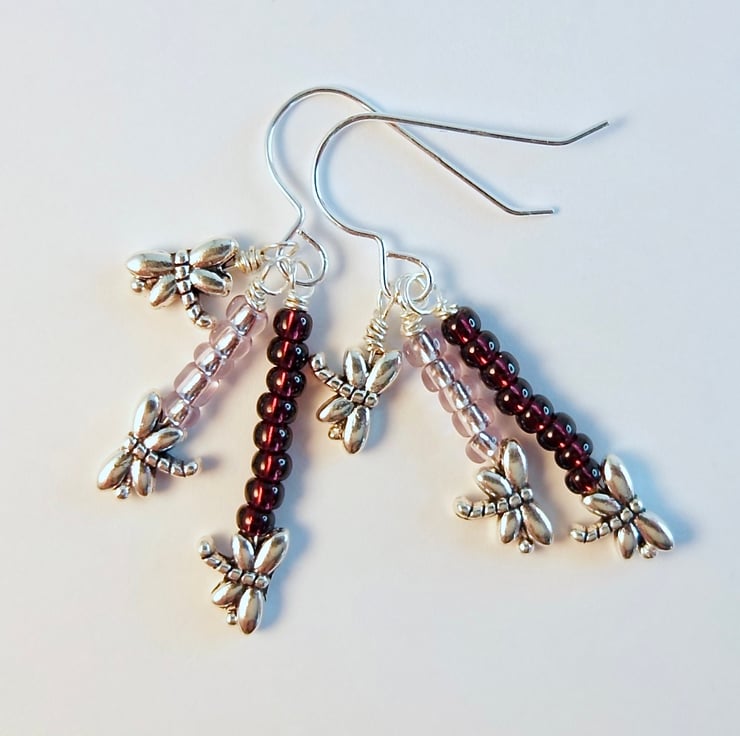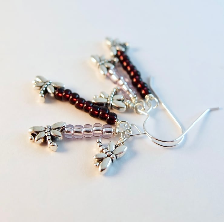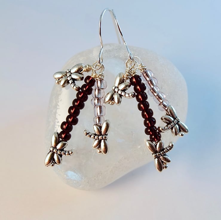 Each earring features three different length strands - an 8mm Tibetan silver dragonfly, an 8mm dragonfly with pale lilac seed beads, and an 8mm dragonfly with purple seed beads.