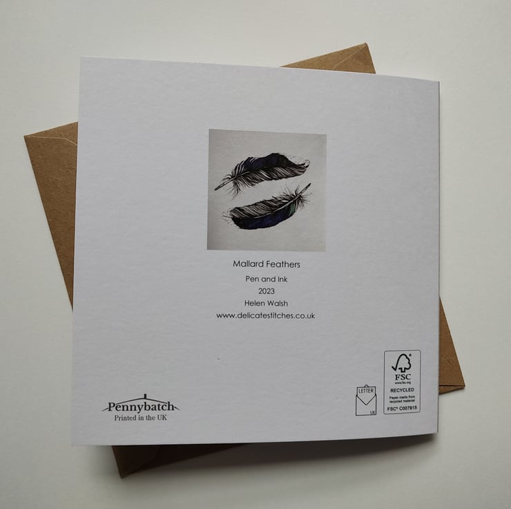 I love collecting and drawing feathers of all sizes, shapes and colours. This card is a photographic print of one of my pen and ink drawings of mallard feathers. I love their iridescent purple and green sheen!