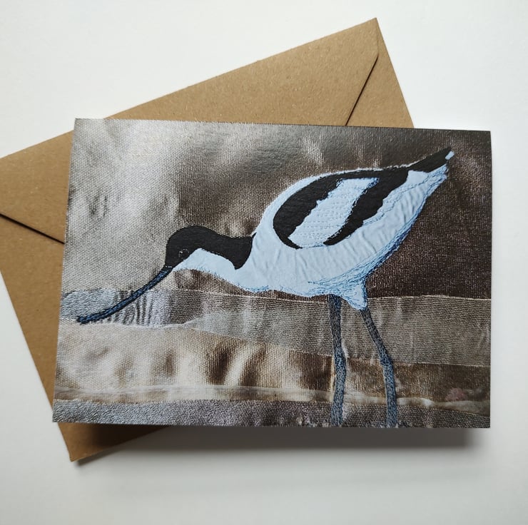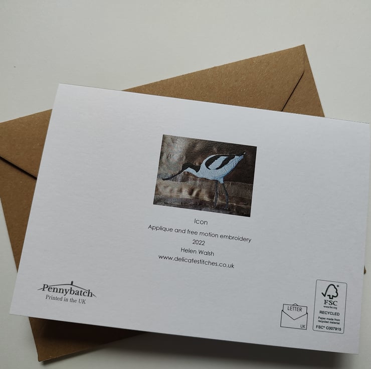 Iconic, graceful and always exciting to spot the avocet is one of my favourite birds. This card is a photographic print of my original textile artwork featuring applique and free motion embroidery.