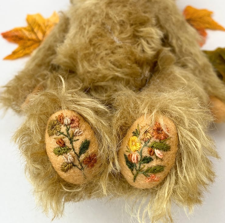 She has wool felt paw pads in pale gold, her foot pads have been hand embroidered in Autumn themed florals using greens, rusts and gold embroidery thread.