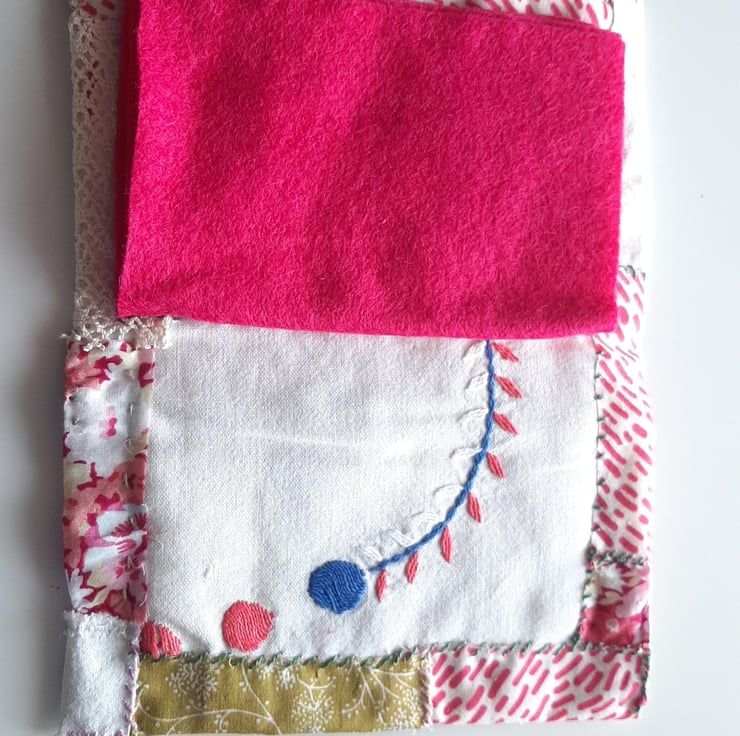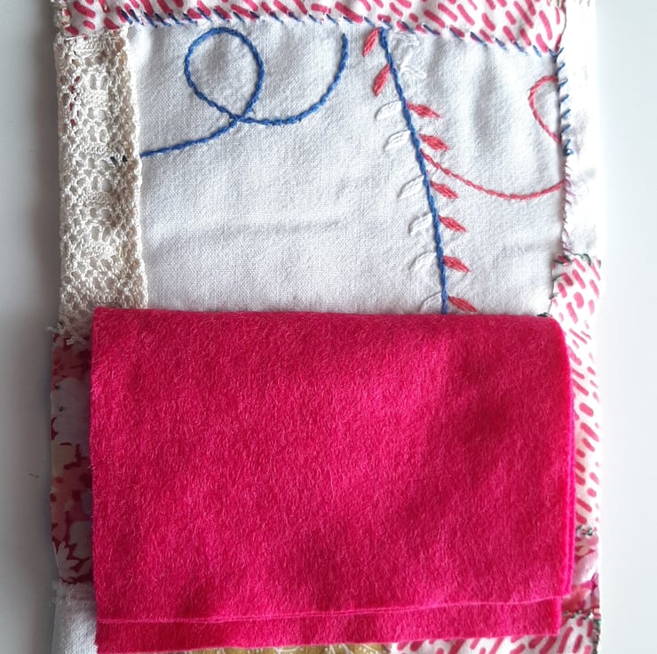 This is a very handy needle book for all sewers. It is made from a piece of vintage embroidery (probably a tray cloth)and some vintage lace from France. I have added my own embroidery,beadwork , applique and slow stitching. It is padded with organic cotton and the pages are made from felt, the lining is from an old tablecloth from Spain. The closure is a wrap around silk ribbon. It is all hand stitched and is totally unique. I try to recycle and repurpose fabric, beads, buttons etc as much as possible in my projects. The colours in reality are deeper than you can see here. Size: W: 3.5" x L:6" ( closed)