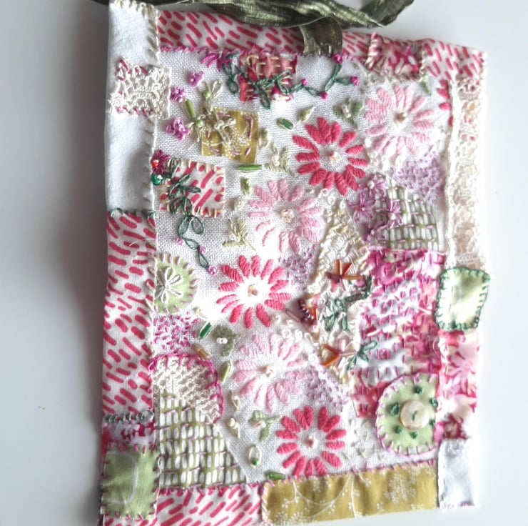 I loved the tray cloth embroidered with pink daisies but, unfortunately, it was damaged so I decided to use some of it to make this needle case. I added a lot more of my own work: embroidery, beading, applique keeping to the pinks but adding the shades of green as a contrast. The lining is from an old table cloth a friend gave me. It is very damaged too, having seen a lot of use but there are still pieces of it I can use.