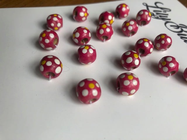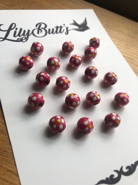 18 Vintage Wooden Flower Beads - 10mm, these are so pretty, pink background with white petals and a yellow centre.