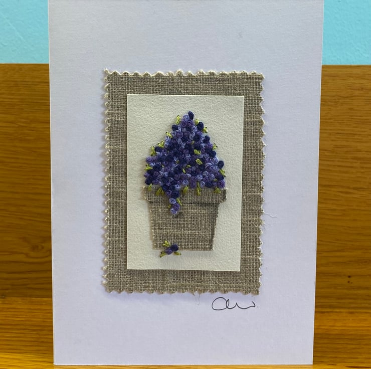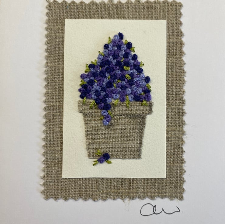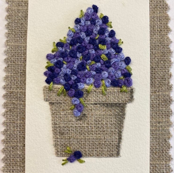 French knots in shades of purple are embroidered on card, then mounted onto textured fabric. The purple flowers are broken up by thread ‘leaves’ with the pot shaded by hand.