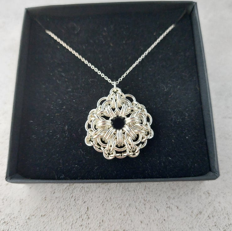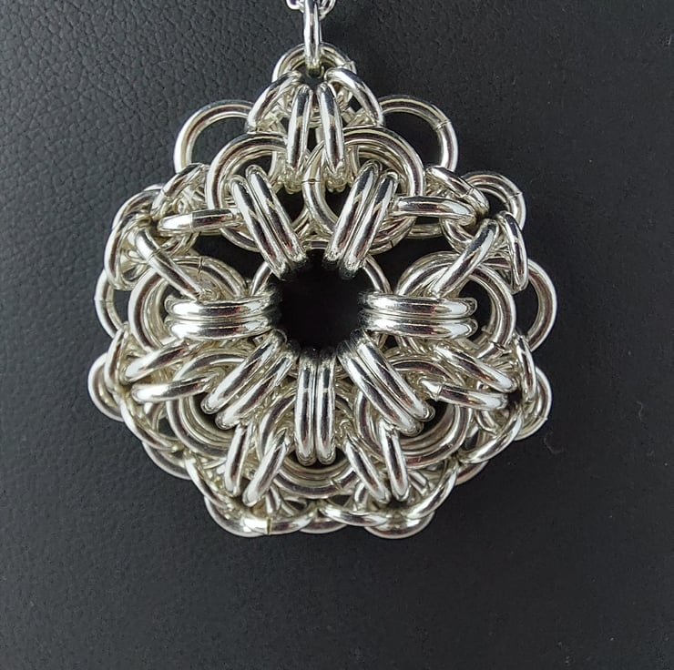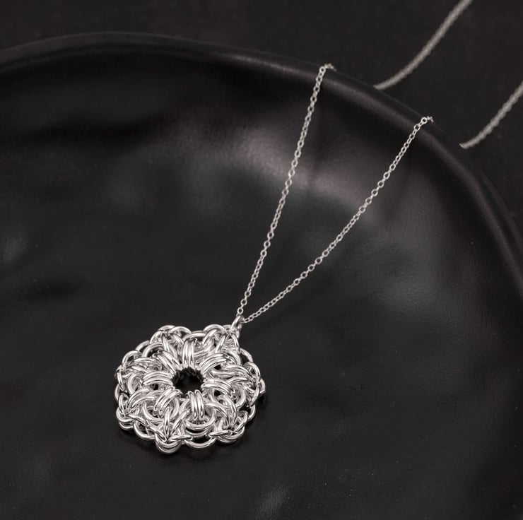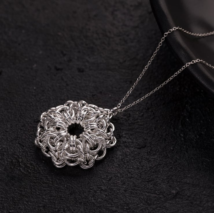 A beautiful detailed sterling silver chainmaille pendant. This chainmaille weave is called Solstice and the pendant is made by linking individual silver rings together.