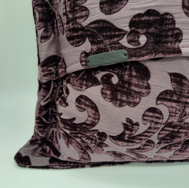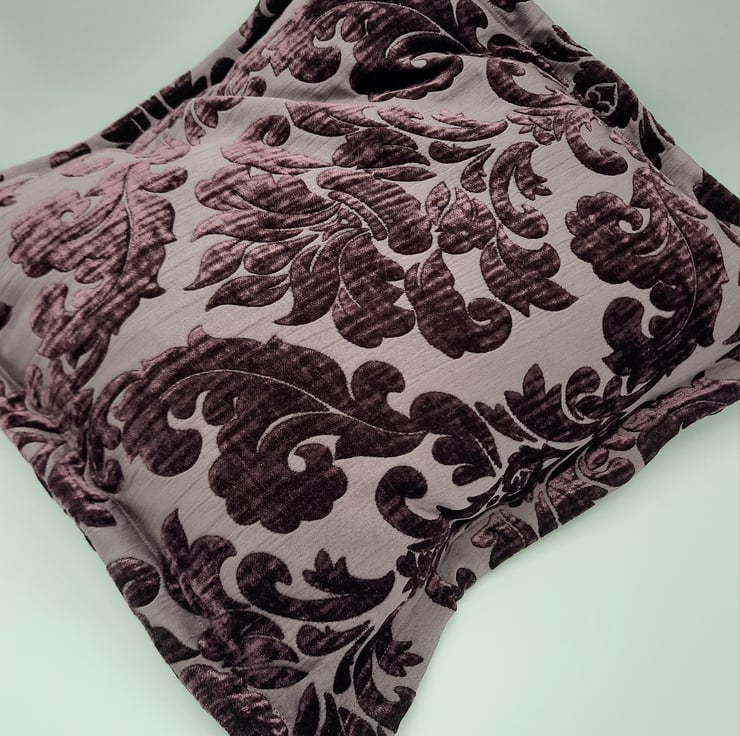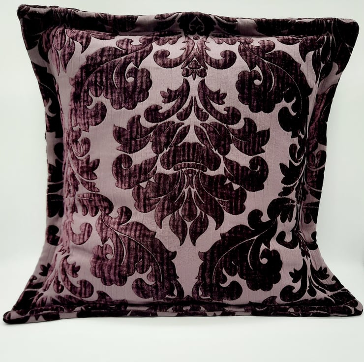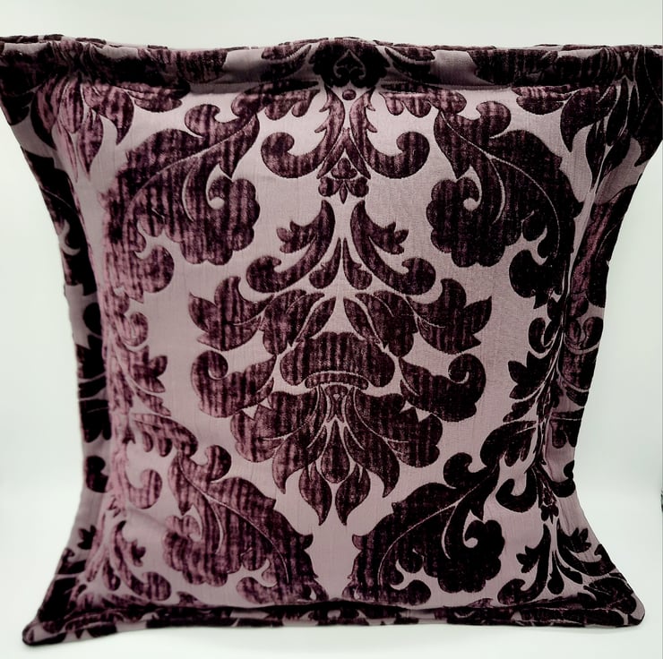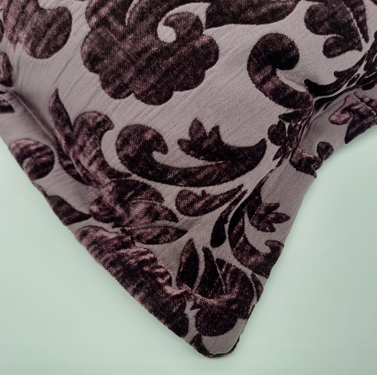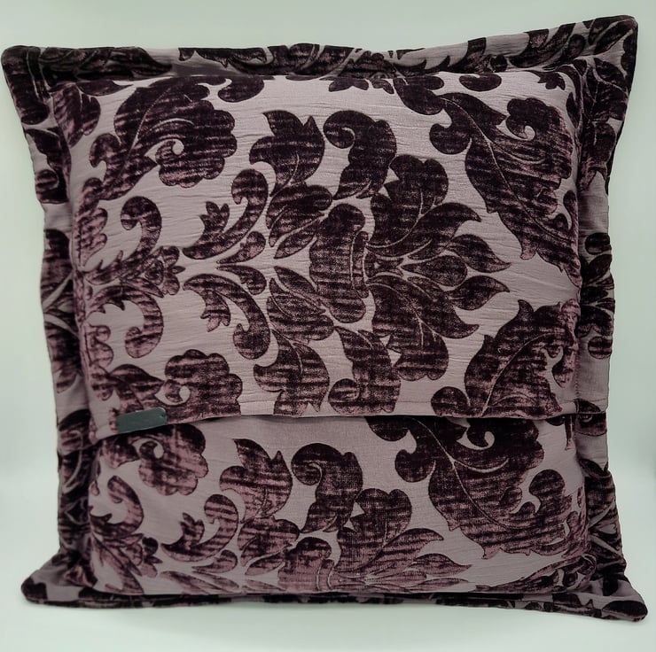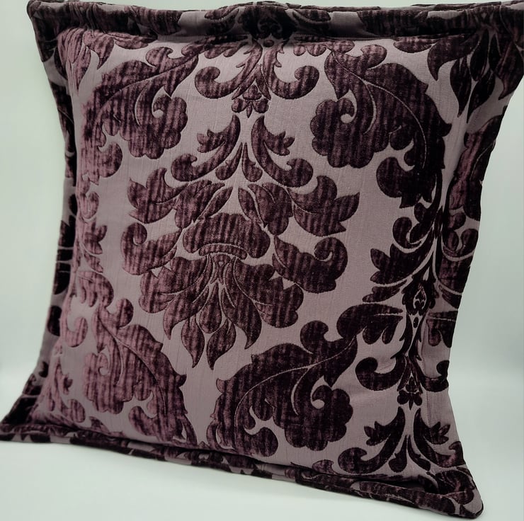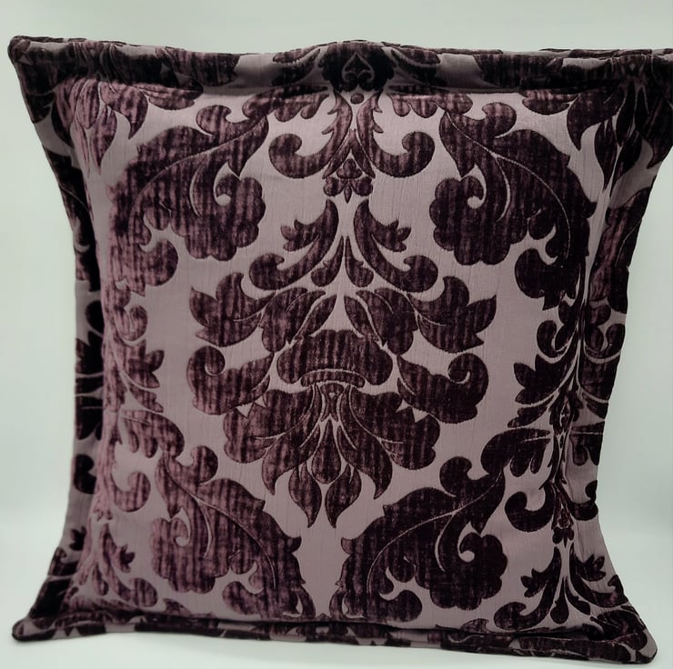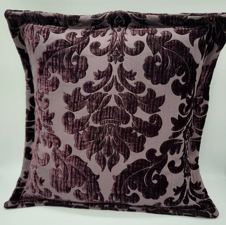 Dark purple plum damask fabric has been used to create this envelope backed cushion cover.