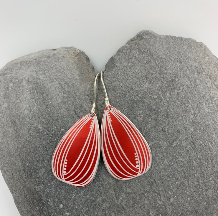 These beautiful lightweight aluminium earrings have been dyed bright red. I designed a stylised tulip that has been laser etched onto the metal. A nod to the Art Nouveau movement and slightly Mackintosh too!
