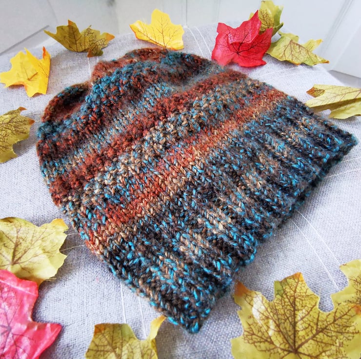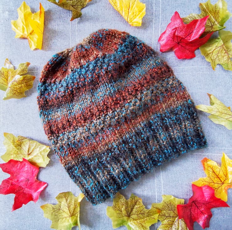 Flaunt your love of fall with this eye-catching, hand knitted striped beanie hat in autumn colours. Russet and gold merge with sienna and brown, interspersed with flecks of teal and chocolate to create stripes of autumnal gorgeousness that will really turn heads.