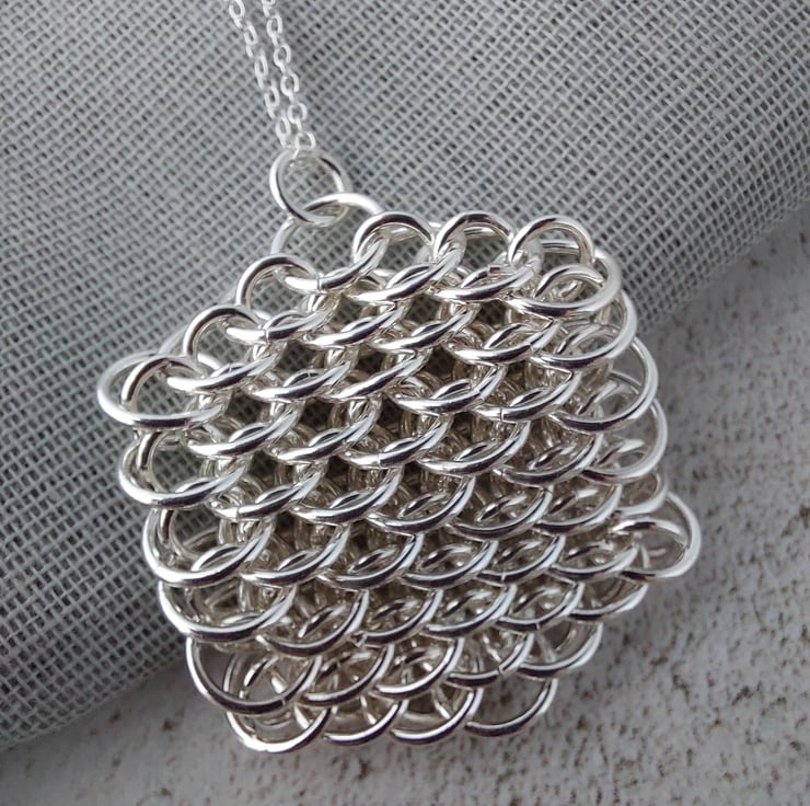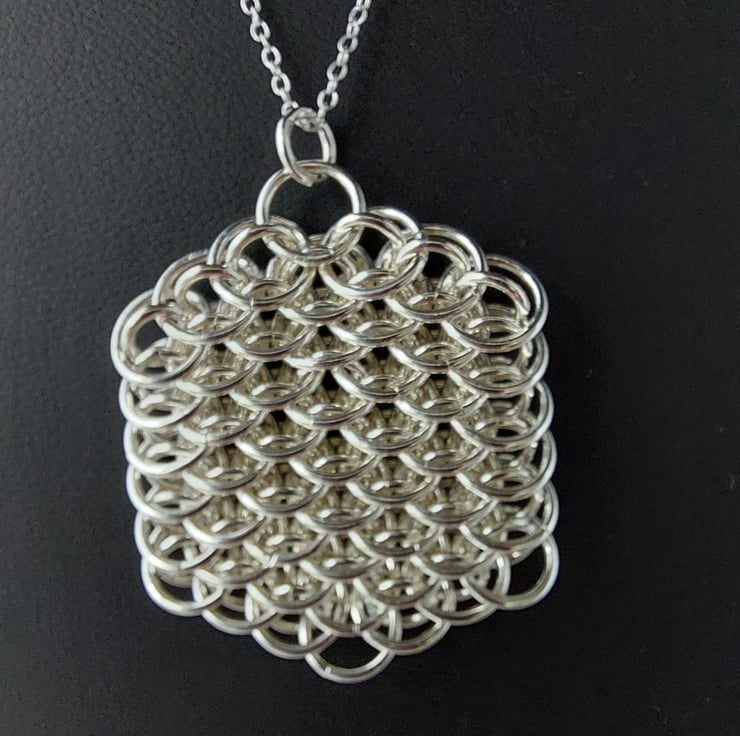 A beautiful, detailed sterling silver dragonscale chainmaille pendant. This has been made from lots of sterling silver jump rings woven together in a specific pattern to make a very fluid feeling pendant.