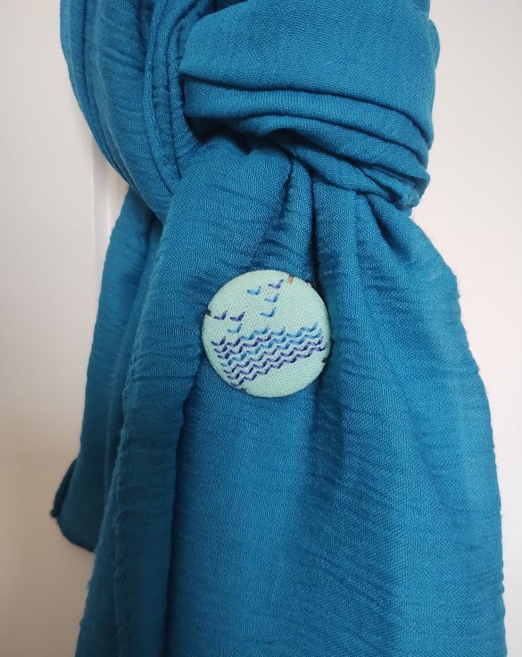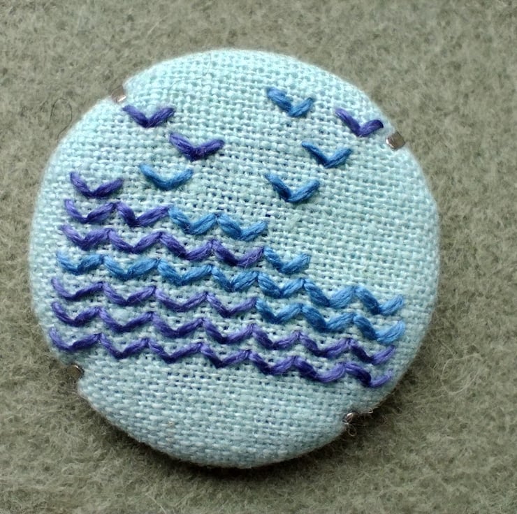 This brooch is hand stitched on sky blue linen fabric and the geometric arrowhead stitch gives the impression of birds flying from the ocean. Finished using a high quality brooch back. Bring some colour and graphic style to your outfit