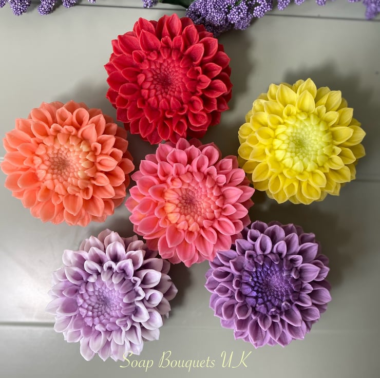 Each soap is individually made, ensuring that every dahlia has its own unique design. The three different dahlias are available in various colors and fragrances, providing a luxurious and personalized experience.