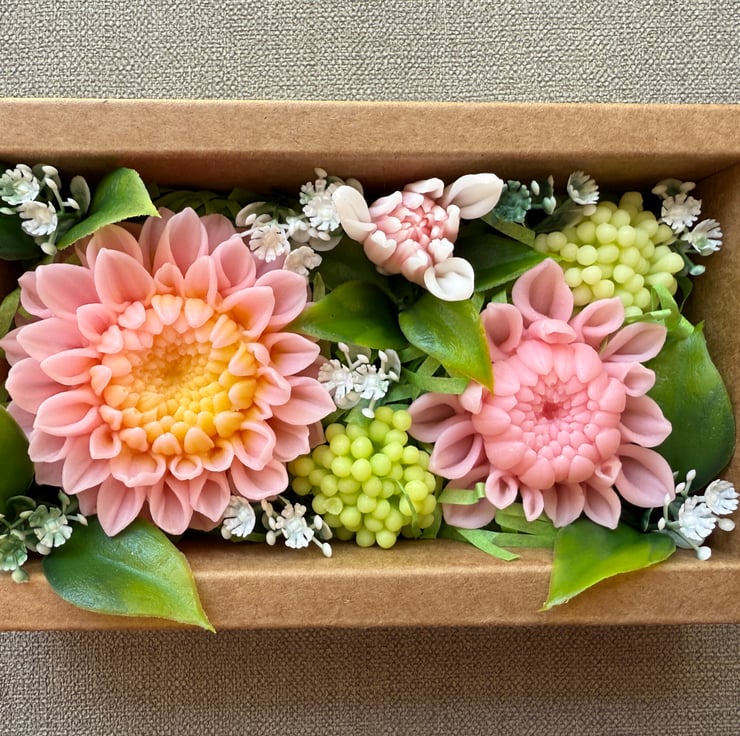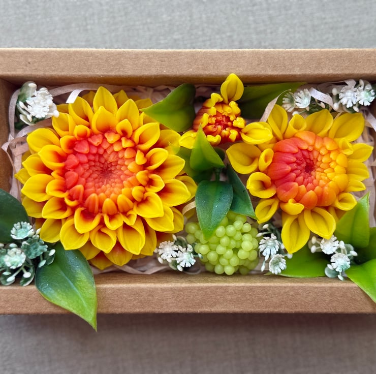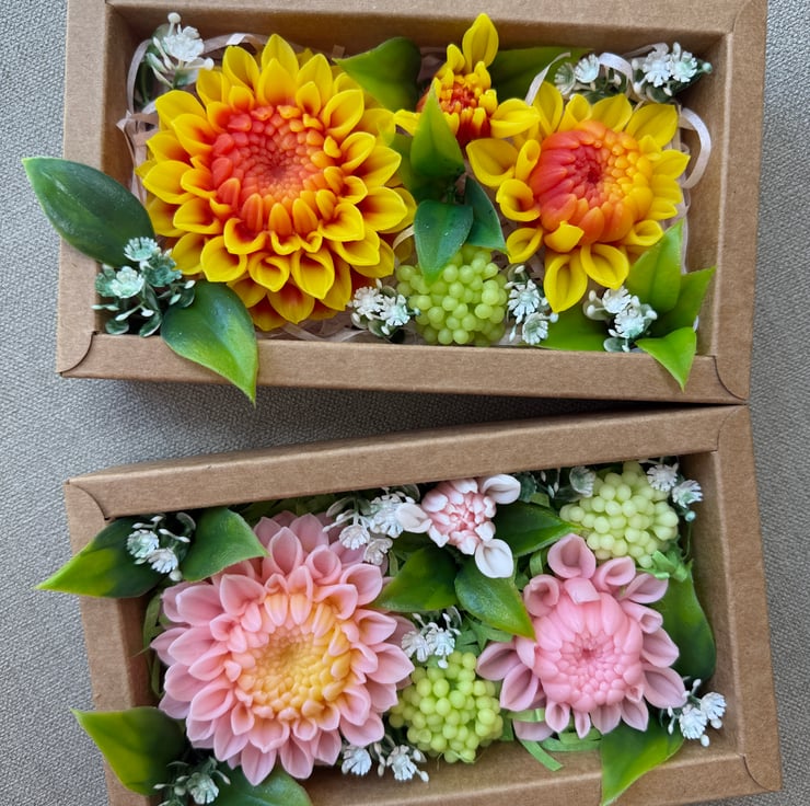 Discover our carefully assembled gift box featuring two uniquely designed dahlia-shaped soaps. This handcrafted set is a thoughtful and distinctive present for any occasion.