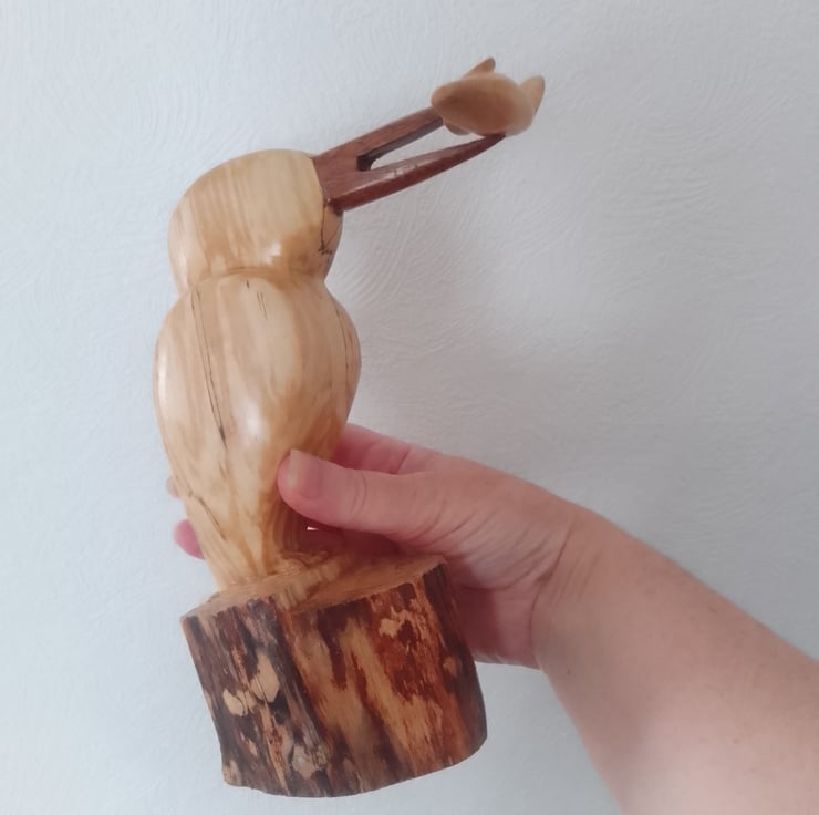 Handmade sculpture of a kingfisher with a detachable fish. Carved from marbled silver birch, beak iroko , fish Monterey pine. It stands 20 cm high, finished with a hard wax oil.